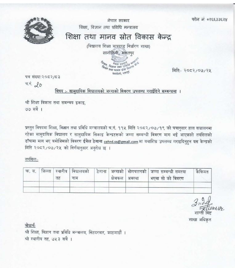 केन्द्रकी शाखा अधिकृत शान्ति बिष्टद्वारा जारी पत्रमा भनिएको छ,‘मन्त्रालयको निर्देशनअनुसार हाल सञ्चालनमा रहेका सामुदायिक विद्यालय र सामुदायिक सिकाइ केन्द्रहरूको जग्गा विवरण माग भई आएको हुँदा माग भएको ढाँचामा विवरण उपलब्ध गराउन अनुरोध गरिएको छ।’