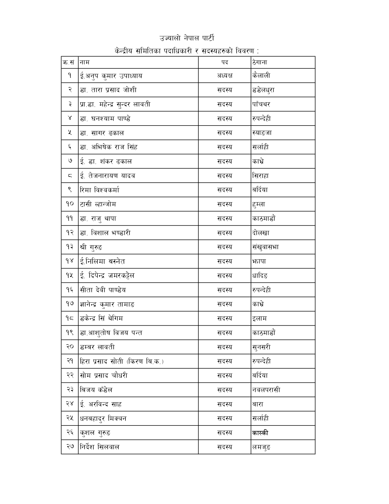 उपाध्यायलाई अध्यक्ष राखिए पनि अन्य सबैलाई सदस्य बनाइएको छ। जसमा डा. ताराप्रसाद जोशी, प्राडा महेन्द्र सुन्दर लावती, डा. घनश्याम पाण्डे, डा. सागर ढकाल, रिमा विश्वकर्मा, टासी ल्हान्जोमलगायत छन्। चुनाव चिह्न ‘बलेको चिम’ माग गरिएको छ।