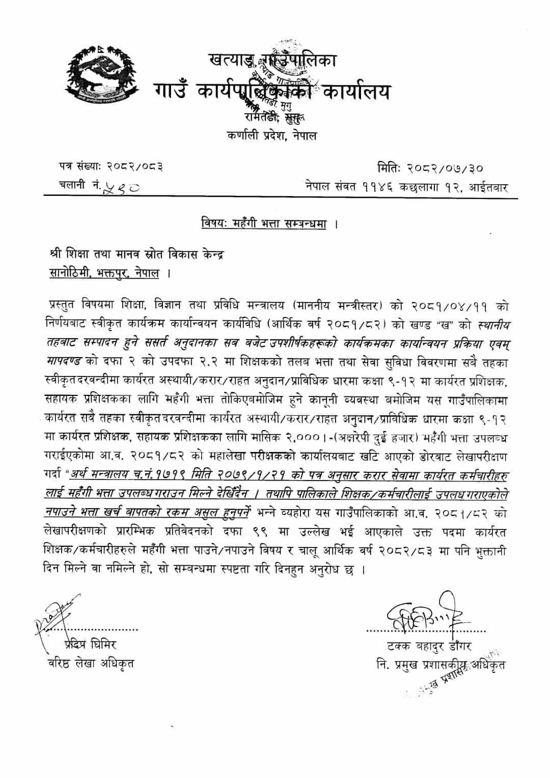 शिक्षा, विज्ञान तथा प्रविधि मन्त्रालयको २०८१ साउन ११ गतेको निर्णयअनुसार तोकिएको कार्यान्वयन कार्यविधि र स्थानीय तहमा प्रयोग हुने ससर्त अनुदानका मापदण्डका आधारमा गाउँपालिकाले कक्षा ९ देखि १२ सम्म कार्यरत प्रशिक्षक तथा सहायक प्रशिक्षकलाई महिनामा रु. २,००० महँगी भत्ता उपलब्ध गराउँदै आएको थियो।