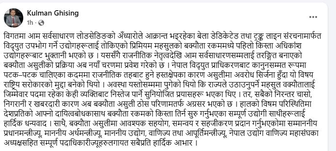 नेपाल विद्युत् प्राधिकरणबाट कानुनसम्मत रूपमा पटक–पटक चालिएका कदममा राजनीतिक तहबाट हुने हस्तक्षेपका कारण असुलीमा अवरोध सिर्जना हुँदा यो विषय राष्ट्रिय सरोकारको मुद्दा बनेको उनले उल्लेख गरेका छन्।