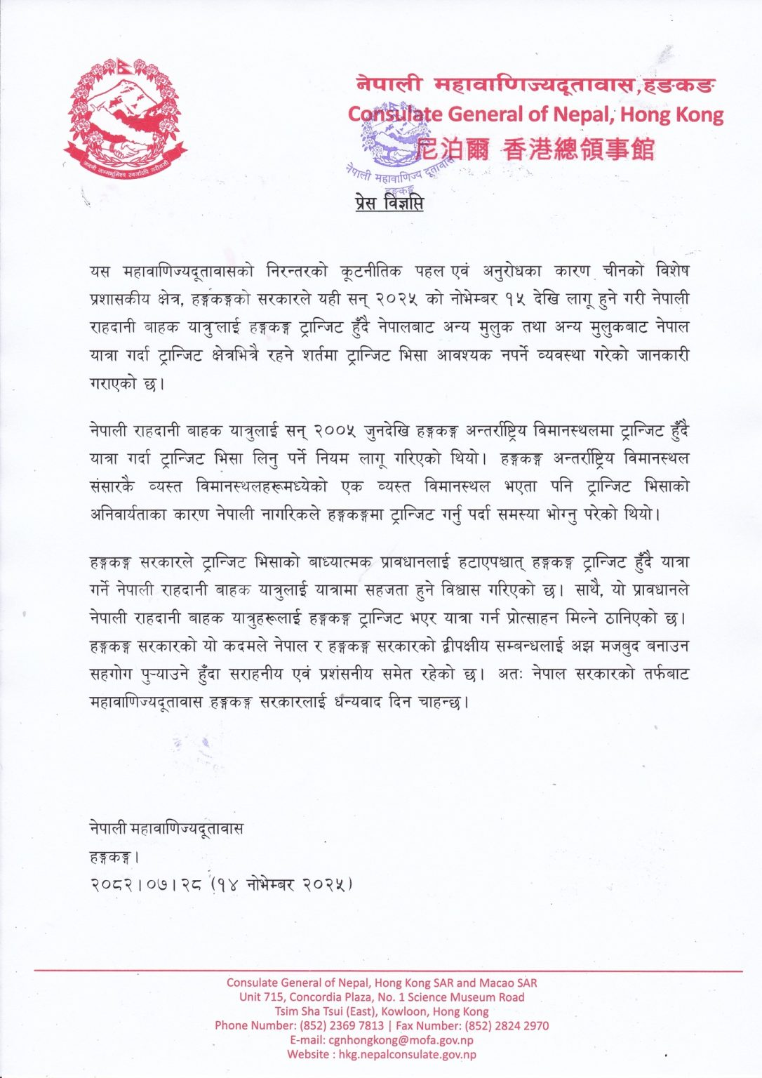 नेपाली महावाणिज्य दूतावास, हङकङले जारी गरेको प्रेस विज्ञप्तिमा निरन्तर कूटनीतिक पहल र औपचारिक अनुरोधका आधारमा हङकङ सरकारले नेपाली राहदानीधारीलाई ट्रान्जिट क्षेत्रभित्र बस्ने शर्तमा भिसा आवश्यक नपर्ने व्यवस्था गरेको जनाएको छ।
