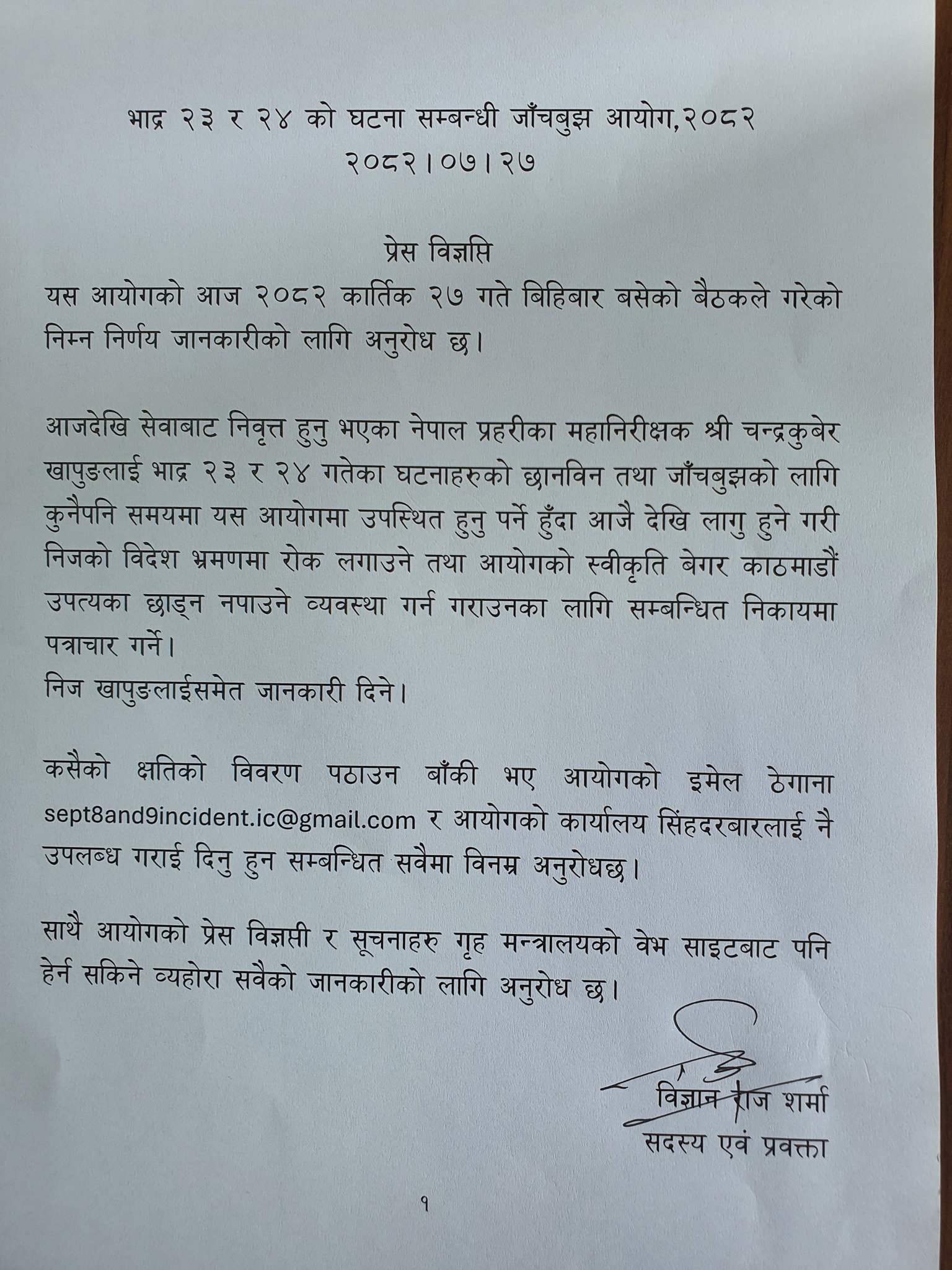 भदौ २३ र २४ गतेको घटनासम्बन्धी जाँचबुझ आयोगको आजको बैठकले खापुङलाई विदेश जान रोक लगाउने निर्णय गरेको हो।
