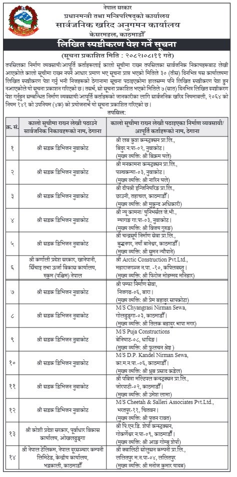 काठमाडौँ- सरकारले १४ वटा निर्माण व्यवसायी तथा आपूर्तिकर्ताहरूलाई कालोसूचीमा राख्ने तयारी गरेको छ।