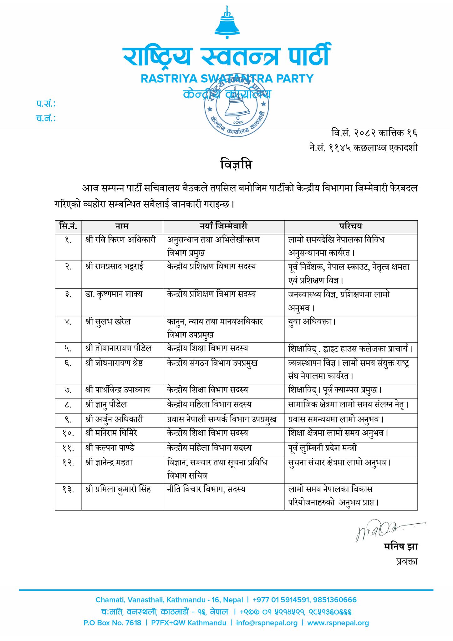 रविकिरण अधिकारीलाई अनुसन्धान तथा अभिलेखीकरण विभाग प्रमुख तोकिएको छ। सुलभ खरेललाई कानुन, न्याय तथा मानवअधिकार विभागको उपप्रमुख, अर्जुन अधिकारीलाई प्रवास नेपाली सम्पर्क विभाग उपप्रमुख, बोधनारायण श्रेष्ठलाई केन्द्रीय संगठन विभाग उपप्रमुख, ज्ञानेन्द्र महतालाई विज्ञान, सञ्चार तथा सूचना प्रविधि विभाग सचिवको जिम्मेवारी दिइएको छ।