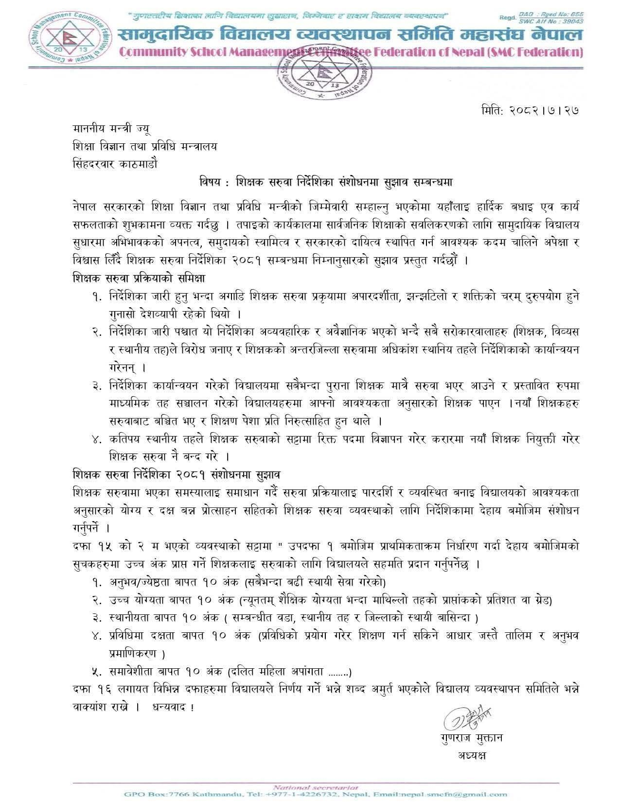 काठमाडौँ- सामुदायिक विद्यालय व्यवस्थापन समिति महासंघ नेपालले शिक्षा, विज्ञान तथा प्रविधिमन्त्री महावीर पुनलाई शिक्षक सरुवा निर्देशिका २०८१ संशोधनका लागि सुझाव दिएको छ। महासंघका अध्यक्ष गुणराज मुक्तानले बधाईसहित पत्र पठाउँदै सार्वजनिक शिक्षाको सुदृढीकरणमा सरकार, समुदाय र अभिभावकको साझा भूमिकाको अपेक्षा व्यक्त गरेका छन्।