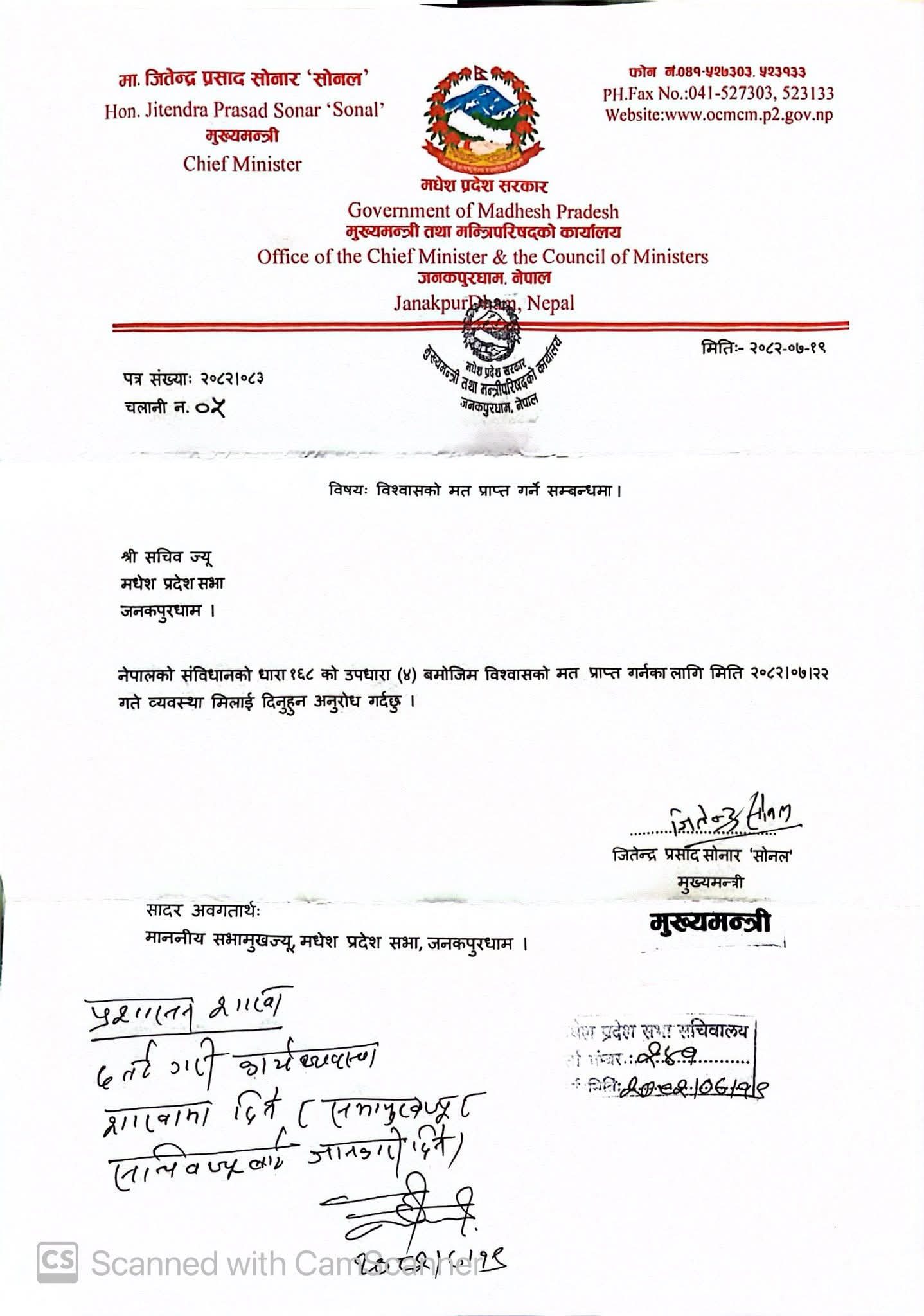 ‘नेपालको संविधानको धारा १६८ को उपधारा (४) बमोजिम विश्वासको मत प्राप्त गर्नका लागि मिति २०८२/०७/२२ गते व्यवस्था मिलाई दिनुहुन अनुरोध गर्दछु,’ मुख्यमन्त्री सोनलले प्रदेश सचिवालयलाई पठाएको पत्रमा उल्लेख छ।