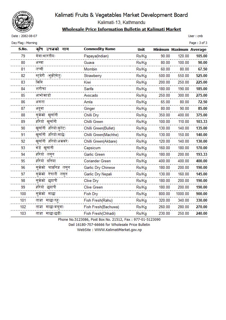 करेला १७०, लौका ९०, लोकल परबल १०५, डल्ले फर्सी ७५, पाकेको फर्सी ४५, कन्य च्याउ २४६, डल्ले च्याउ ३९२, कुरिलो ११०० र ब्रोकाउली १५० रुपैयाँ प्रतिकिलो थियो।