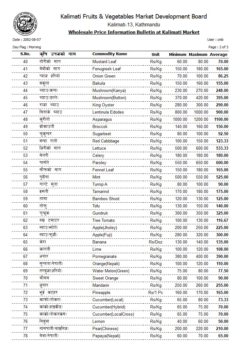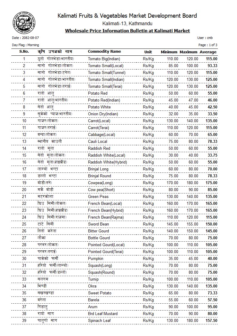 करेला १७०, लौका ९०, लोकल परबल १०५, डल्ले फर्सी ७५, पाकेको फर्सी ४५, कन्य च्याउ २४६, डल्ले च्याउ ३९२, कुरिलो ११०० र ब्रोकाउली १५० रुपैयाँ प्रतिकिलो थियो।