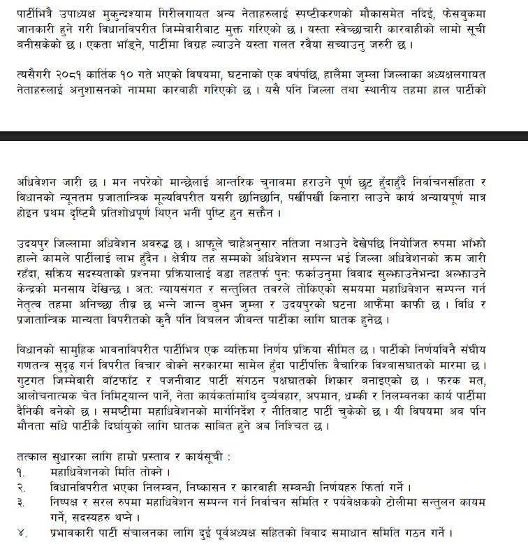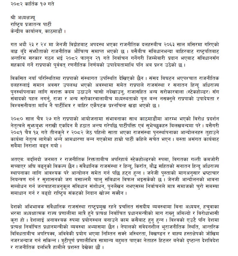 काठमाडौँ- राप्रपामा अध्यक्ष राजेन्द्र लिङ्देनको शैलीप्रति असन्तुष्ट पक्षले पार्टी सुधारका लागि ४ बुँदे प्रस्ताव र कार्यसूची अघि सारेको छ। आज बालुवाटारस्थित नेपाल नेपाल हाउसमा बसेको इतरपक्षको बैठकले चार बुँदे प्रस्ताव पारित गरेको हो।
