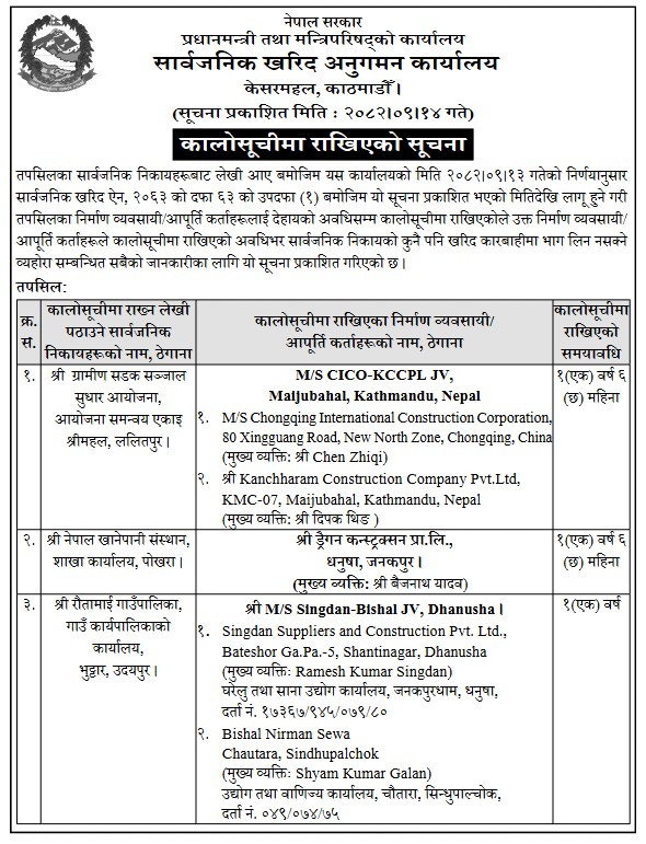 कार्यालयले आज सूचना जारी गर्दै विभिन्न निकायबाट कालोसूचीमा राख्नको लागि लेखि पठाएअनुसार ती निर्माण कम्पनीलाई कालोसूचीमा राखिएको जानकारी दिएको हो। जिम्मा लिएको काम समयमै पूरा नगर्ने निर्माण कम्पनीलाई सार्वजनिक खरिद ऐन, २०६३ को दफा ६३ को उपदफा १ बमोजिम कालोसूचीमा राखिएको सूचनामा उल्लेख छ।