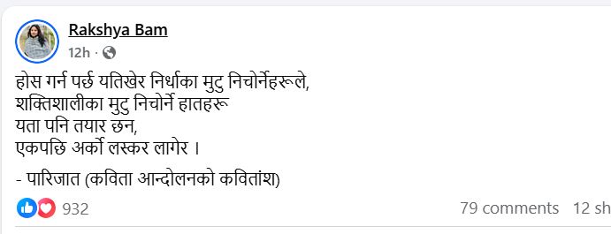 वैकल्पिक शक्ति मिलेपछि रक्षा बमले सेयर गरिन् पारिजातको कविता