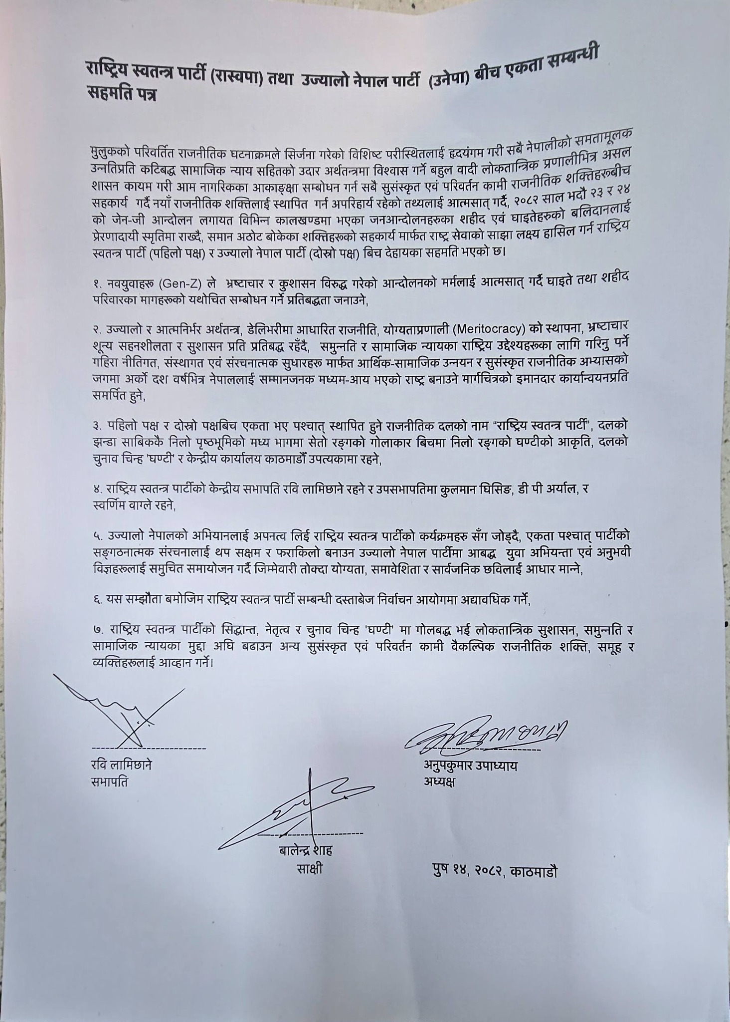 सहमतिपत्रमा रास्वपा सभापति रवि लामिछाने, उज्यालो नेपाल पार्टीका अध्यक्ष अनुपकुमार उपाध्याय र साक्षीका रूपमा बालेन्द्र शाहले हस्ताक्षर गरेका छन्।