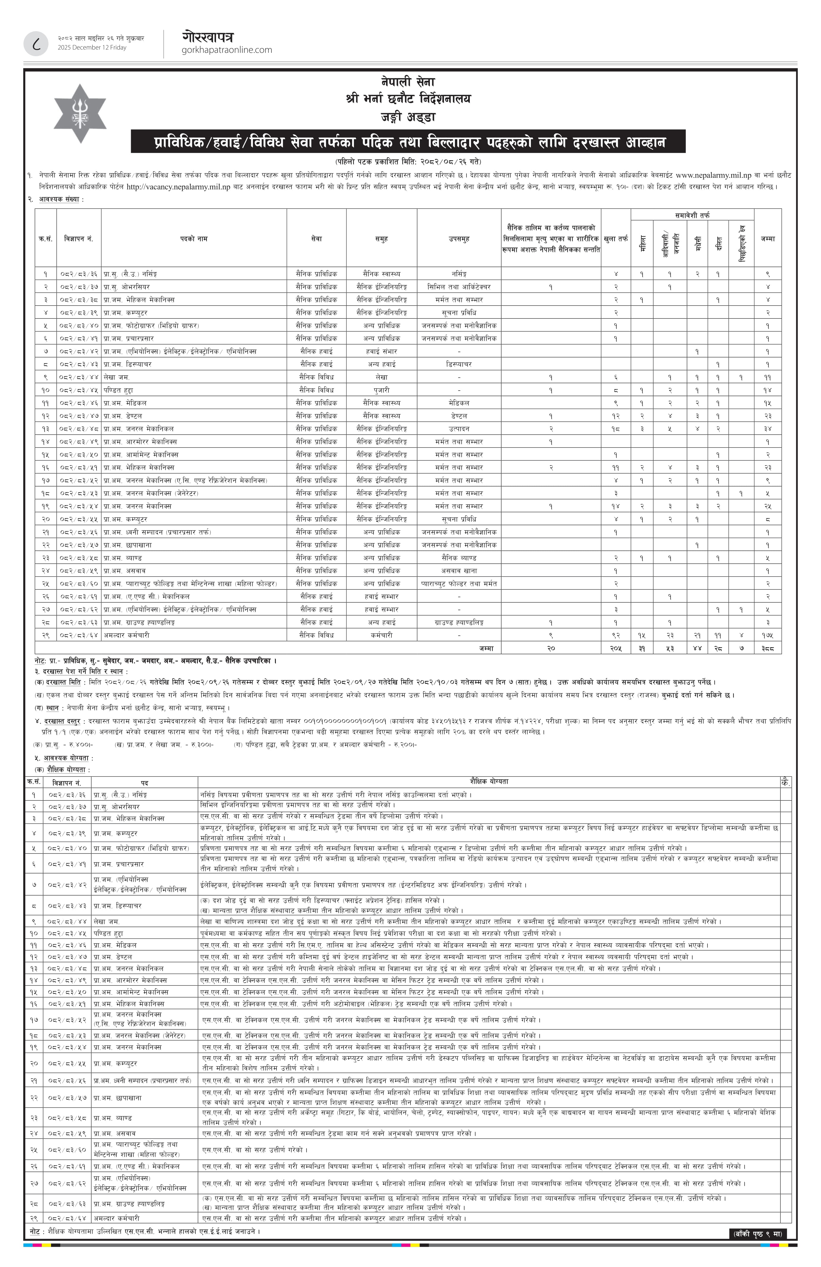 नर्सिङ, ओभरसियर, भेहिकल मेकानिक्स, भिडिओग्राफर, पुजारीलगायत विभिन्न स्वास्थ्य, इन्जिनियरिङ, प्राविधिक तथा हवाई समूहका पदहरू भर्ना गर्न दरखास्त मागिएको छ।