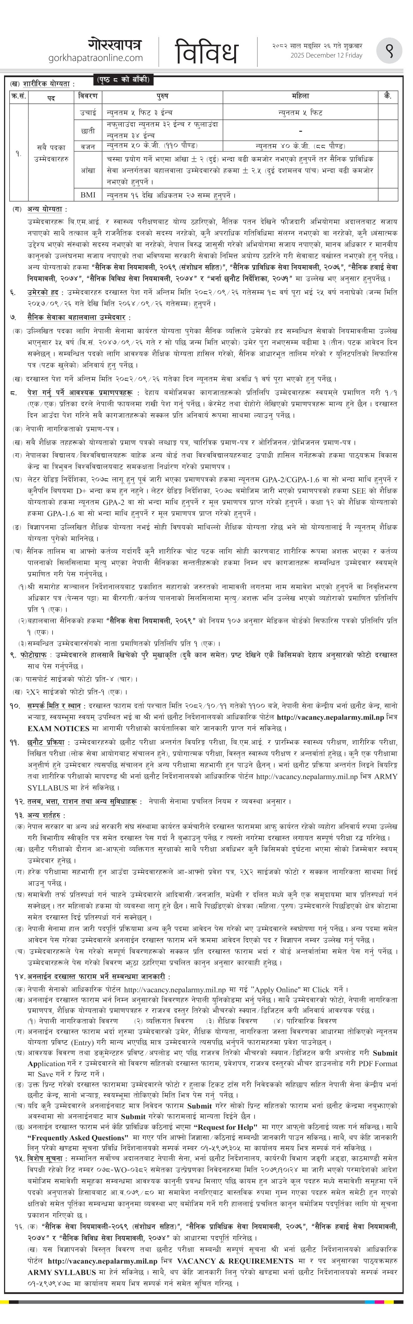 काठमाडौँ- नेपाली सेनाले नयाँ भर्ना खुलाएको छ। सेनाले शुक्रबार सूचना जारी गर्दै विभिन्न प्राविधिक पदहरूमा ३८८ जना कर्मचारी पदपूर्तिका लागि दरखास्त आह्वान गरेको हो।