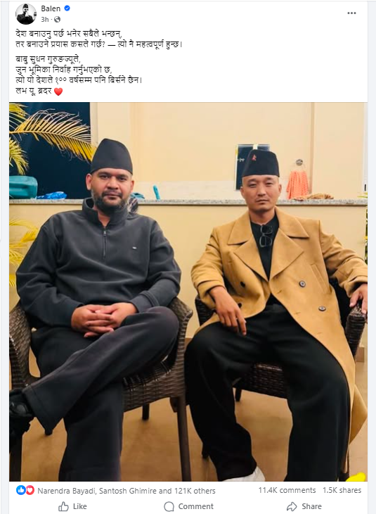 ‘देश बनाउनु पर्छ भनेर सबैले भन्छन्, तर बनाउने प्रयास कसले गर्छरु त्यो नै महत्वपूर्ण हुन्छ,’ उनले लेखेका छन्, ‘बाबु सुधन गुरुङज्यूले जुन भूमिका निर्वाह गर्नुभएको छ, त्यो यो देशले १०० वर्षसम्म पनि बिर्सने छैन। लभ यू, ब्रदर।’