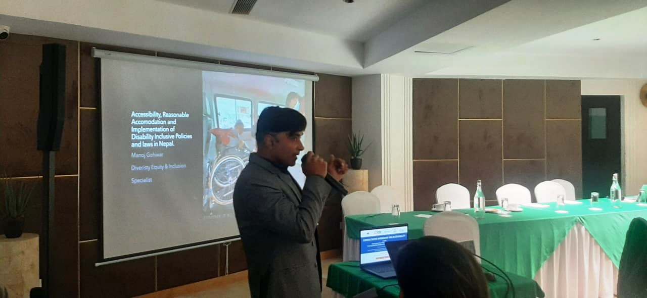 कार्यक्रममा डाइभर्सिटी, इक्विटी एण्ड इन्क्लुजन स्पेसलिस्ट मनोज गोहीवारले राष्ट्रिय नीतिहरू, कानुनी संरचना तथा व्यावहारिक चुनौतीहरूबारे विस्तृत प्रस्तुतीकरण गरे। उनको प्रस्तुतीकरणमा नेपालको समावेशी नीति संरचना, हाल लागू अवस्थामा रहेका पहुँचसम्बन्धी व्यवस्था तथा स्थानीय तहमा देखिने मुख्य व्यवहारिक कठिनाइहरू समेटिएका थिए।