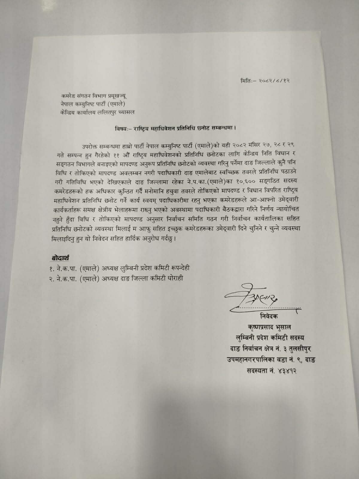 यस्तै जिल्ला पदाधिकारी पाँच जना र आफ्ना नजिककालाई प्रतिनिधि बनाएको भन्दै खारेज गर्न उनीहरूले माग गरेका छन्। प्रतिनिधि छनौटमा विधि प्रक्रिया पालना नगरेको भन्दै यसअघि पनि संगठन विभागमा उजुरी परेको थियो।