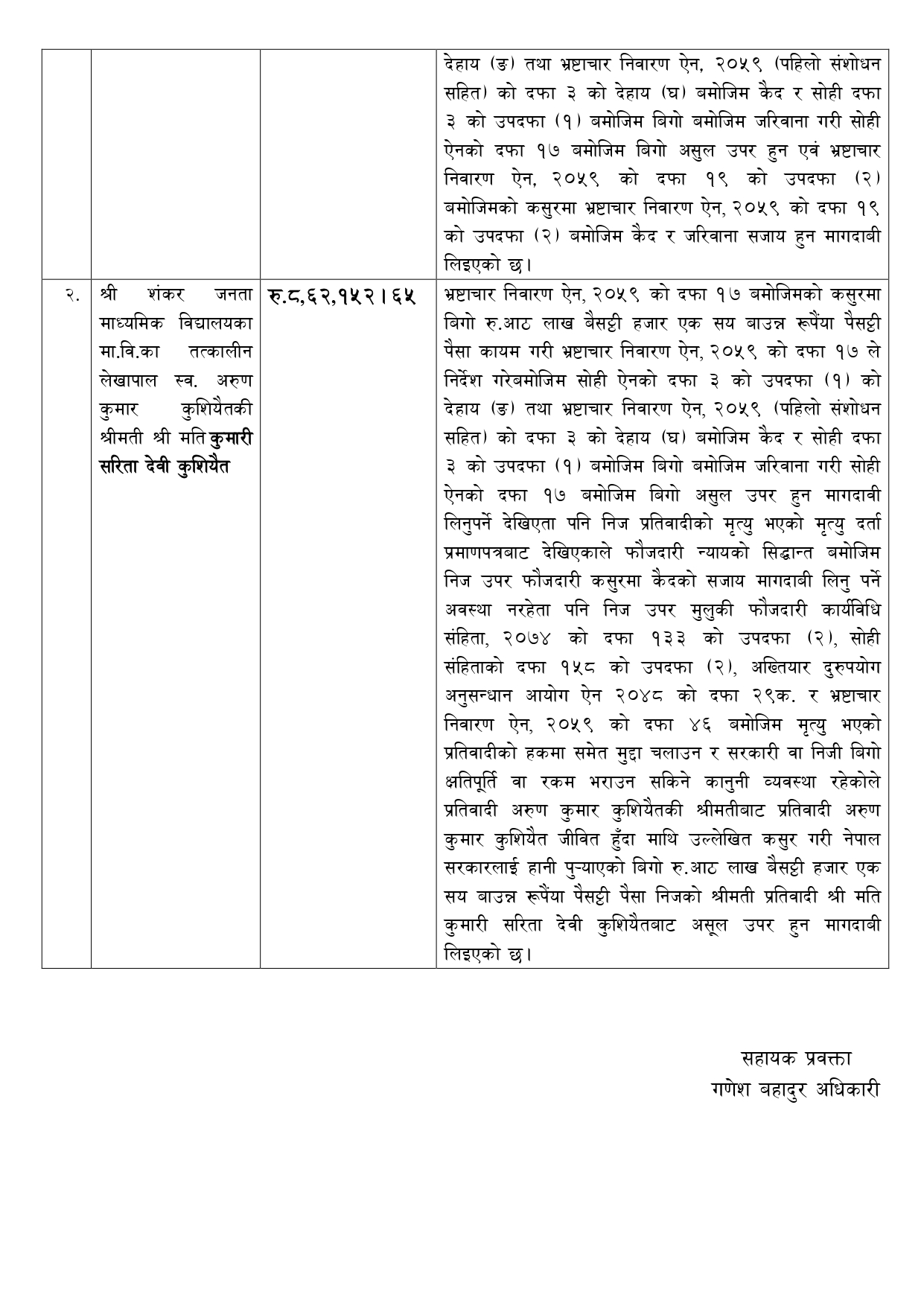 प्रधानाध्यापक धनिकलाल र अरुणकुमारलाई जनही ८ लाख ६२ हजार १५२ रुपैयाँ बिगो माग दाबी गरेको अख्तियारको सहायक प्रवक्ता गणेशबहादुर अधिकारीले जानकारी दिए। आपसी मिलोमतोमा सरकारी रकम हिनामिना गरेको अख्तियारको भनाइ छ।