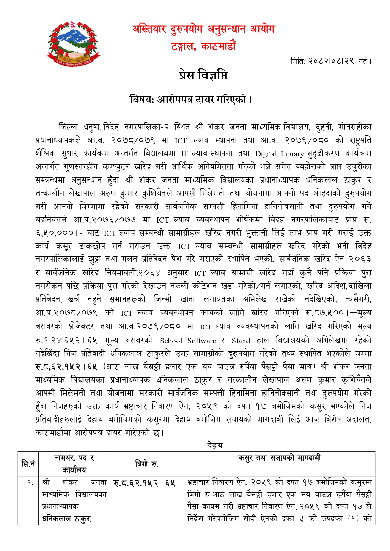 धनुषाको विदेह नगरपालिका-२ दुहवीको शंकर जनता माध्यमिक विद्यालयका प्रधानाध्यापक धनिकलाल ठाकुर र लेखापाल अरुणकुमार कुशियैतविरुद्ध अख्तियारले सोमबार मुद्दा दायर गरेको हो।