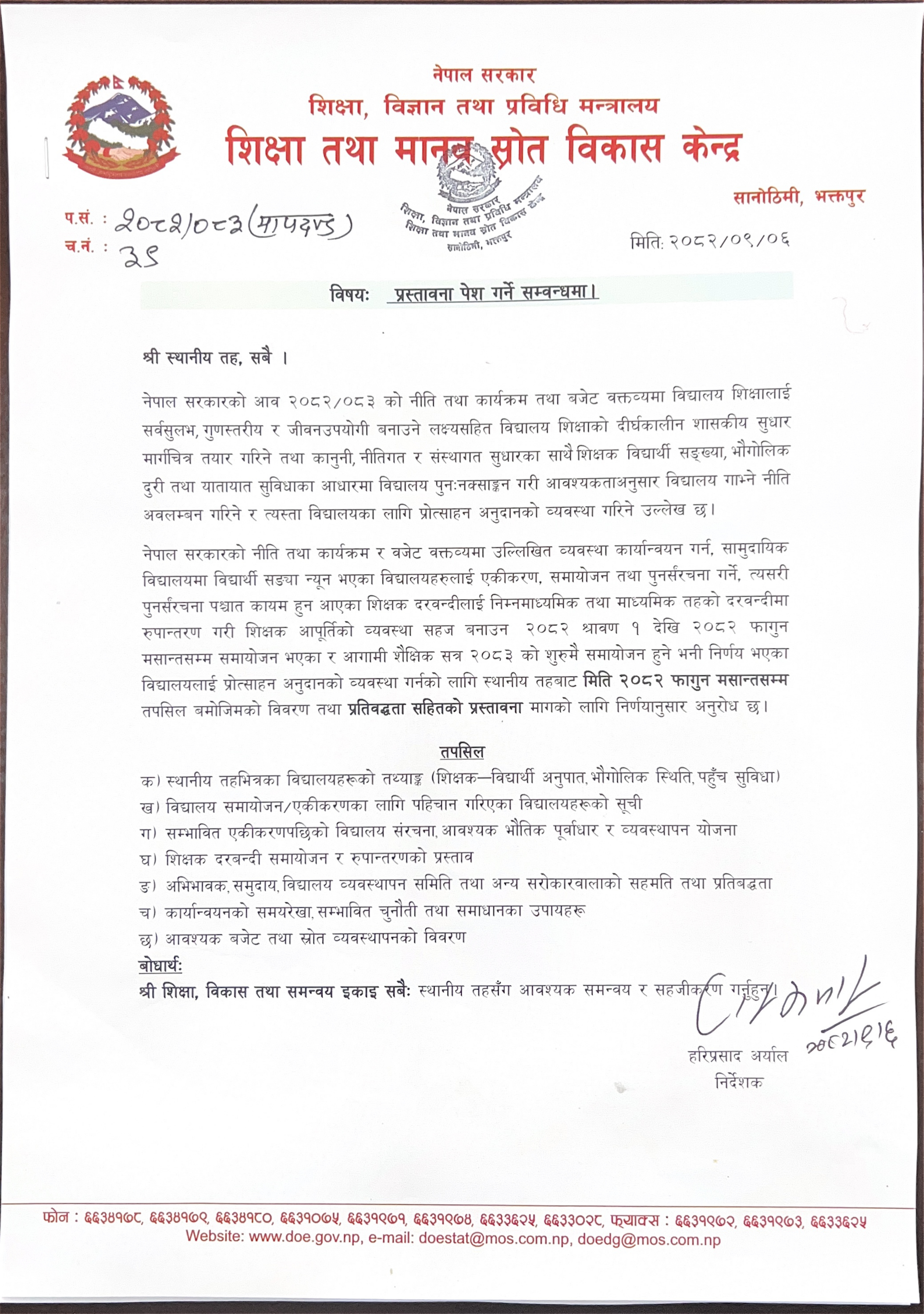 काठमाडौँ- आगामी आर्थिक वर्ष २०८२/०८३ को नीति तथा कार्यक्रम तथा बजेट वक्तव्यअनुसार विद्यालय शिक्षालाई सर्वसुलभ, गुणस्तरीय र जीवनउपयोगी बनाउने उद्देश्यले सामुदायिक विद्यालयको पुनः नक्सांकन तथा एकीकरण प्रक्रिया अघि बढाइने भएको छ। यसै सन्दर्भमा शिक्षा तथा मानव स्रोत विकास केन्द्र, सानोठिमी, भक्तपुरले सबै स्थानीय तहसँग विद्यालय एकीकरणसम्बन्धी प्रस्तावना माग गरेको छ।