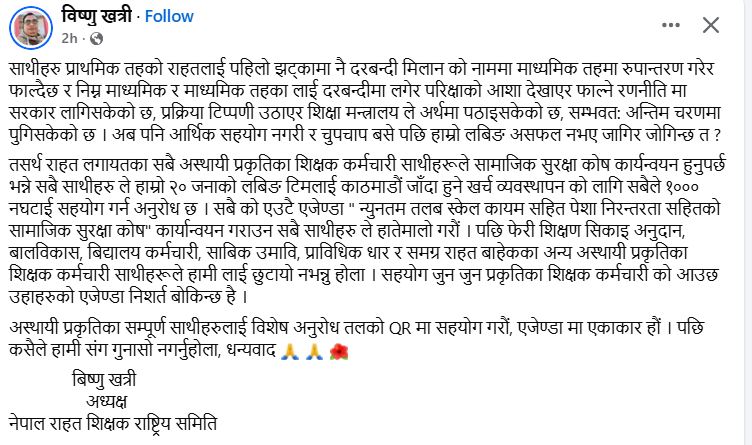 सामाजिक सञ्जालमा राहत शिक्षकको पेसागत हकहितका लागि भन्दै विभिन्न व्यक्ति तथा समूहले रकम उठाइरहेका छन्। ४२ हजार राहत शिक्षकहरूले लामो समयदेखि पेसागत स्थायित्वको माग राख्दै आएका छन्।
