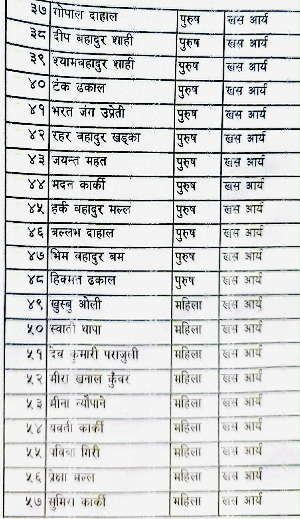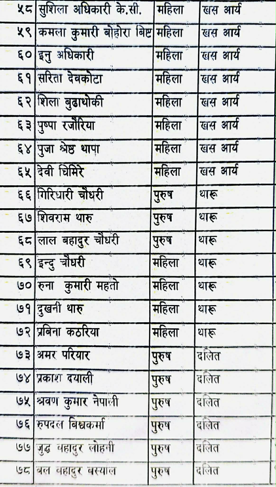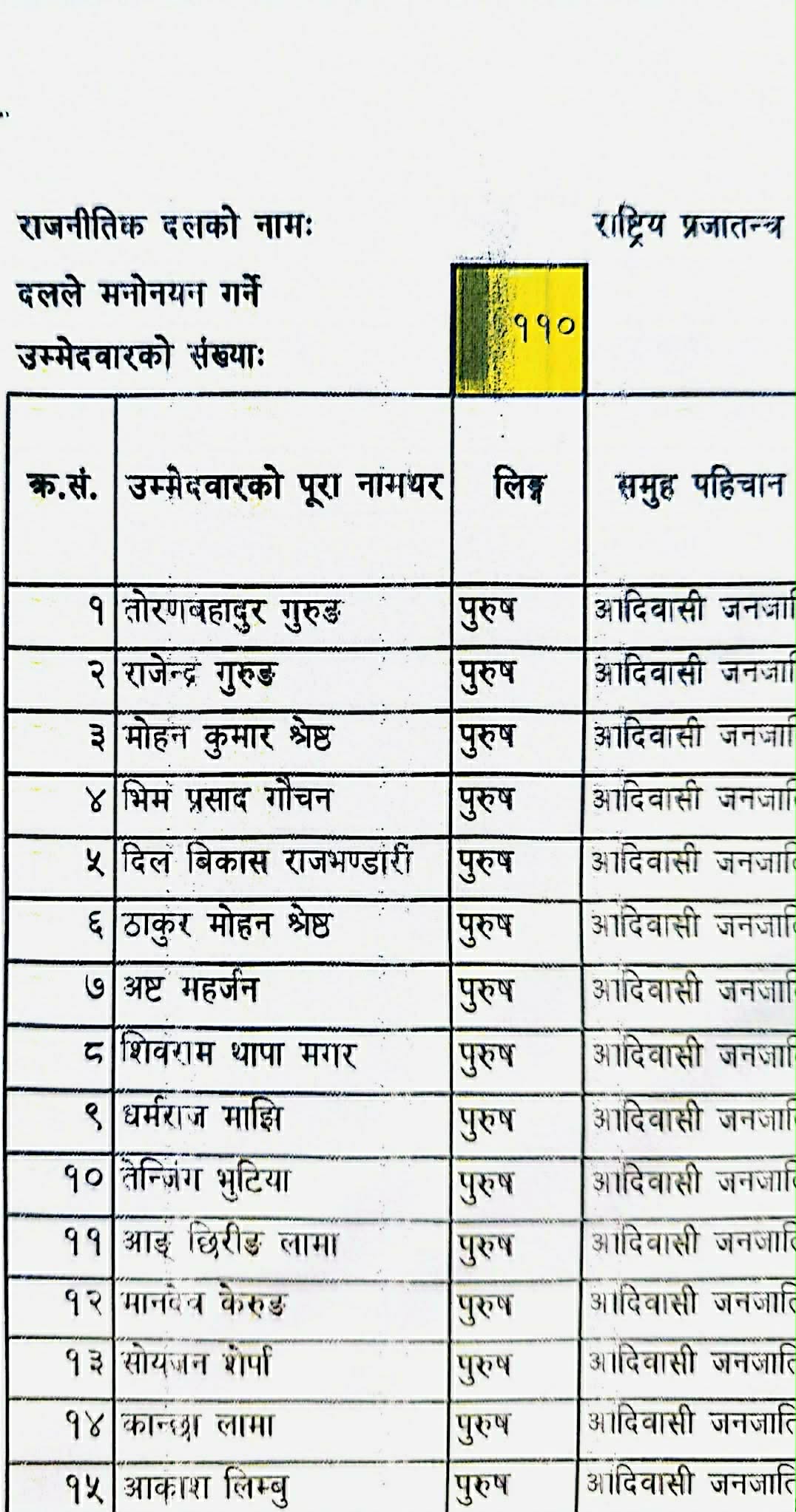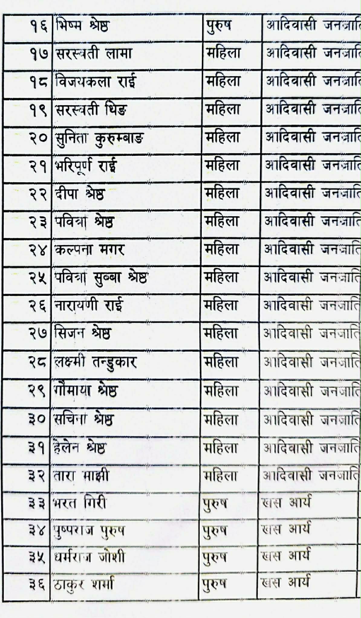 जनजातितर्फ तोरणबहादुर गुरुङ पहिलो, राजेन्द्र गुरुङ दोस्रो र मोहनकुमार श्रेष्ठ तेस्रो सूचीमा छन्।