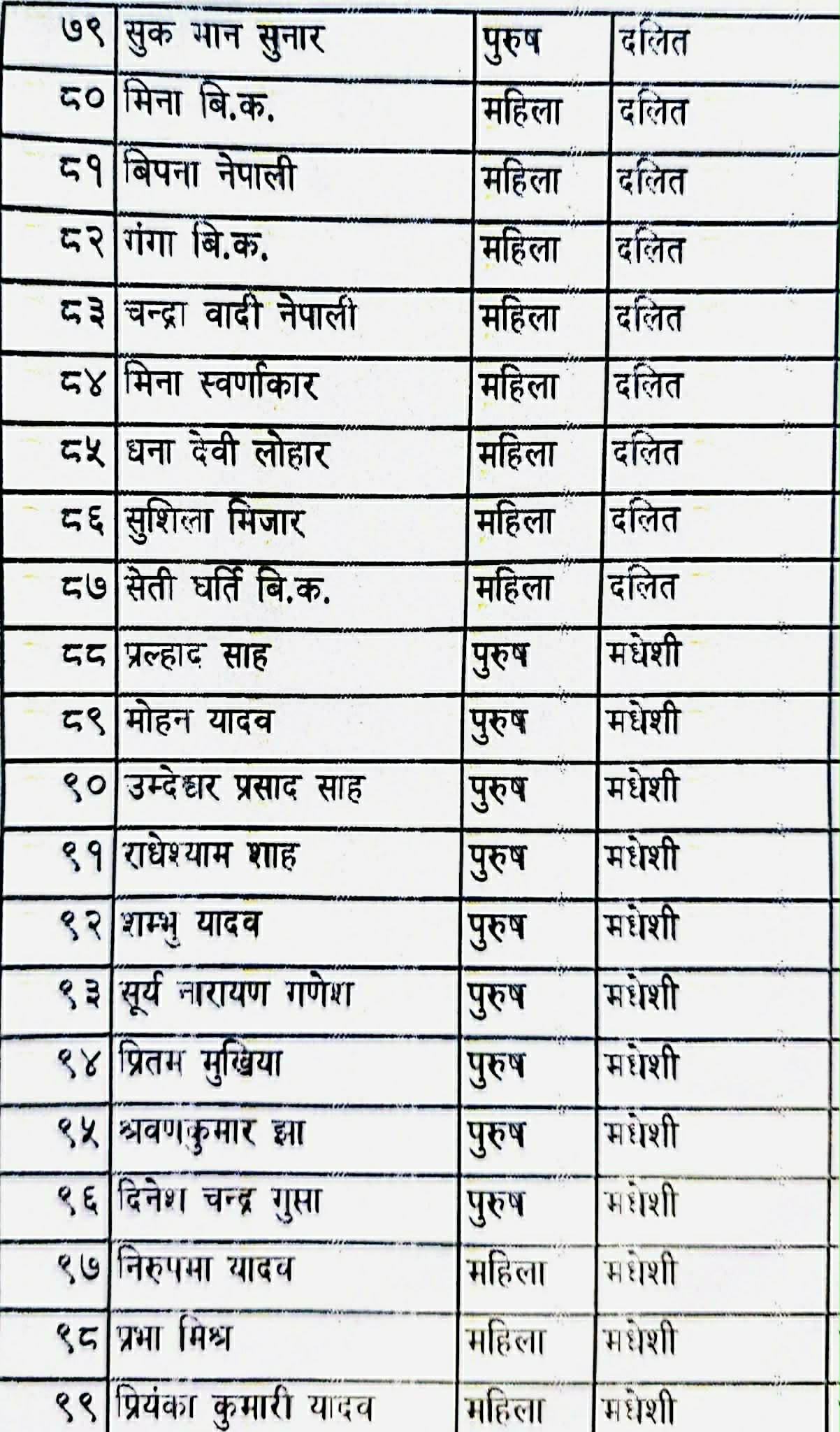 यसअघि नै विगत (२०६४ साल) सम्म समानुपातिकमा परेकालाई फेरि नराख्ने निर्णय गरेको राप्रपाले सबैजसो विगतमा प्राथमिकतामा नपरेकाहरू सूचीमा छन्। खसआर्य महिलातर्फ भने खुस्बु ओली पहिलो नम्बरमा बन्दसूचीमा परेकी छन्। यस्तै दोस्रो नम्बरमा स्वाती थापा छिन्। यस्तै जनजातितर्फ पार्टी प्रवक्ता मोहनकुमार श्रेष्ठ पनि सूचीमा छन्।