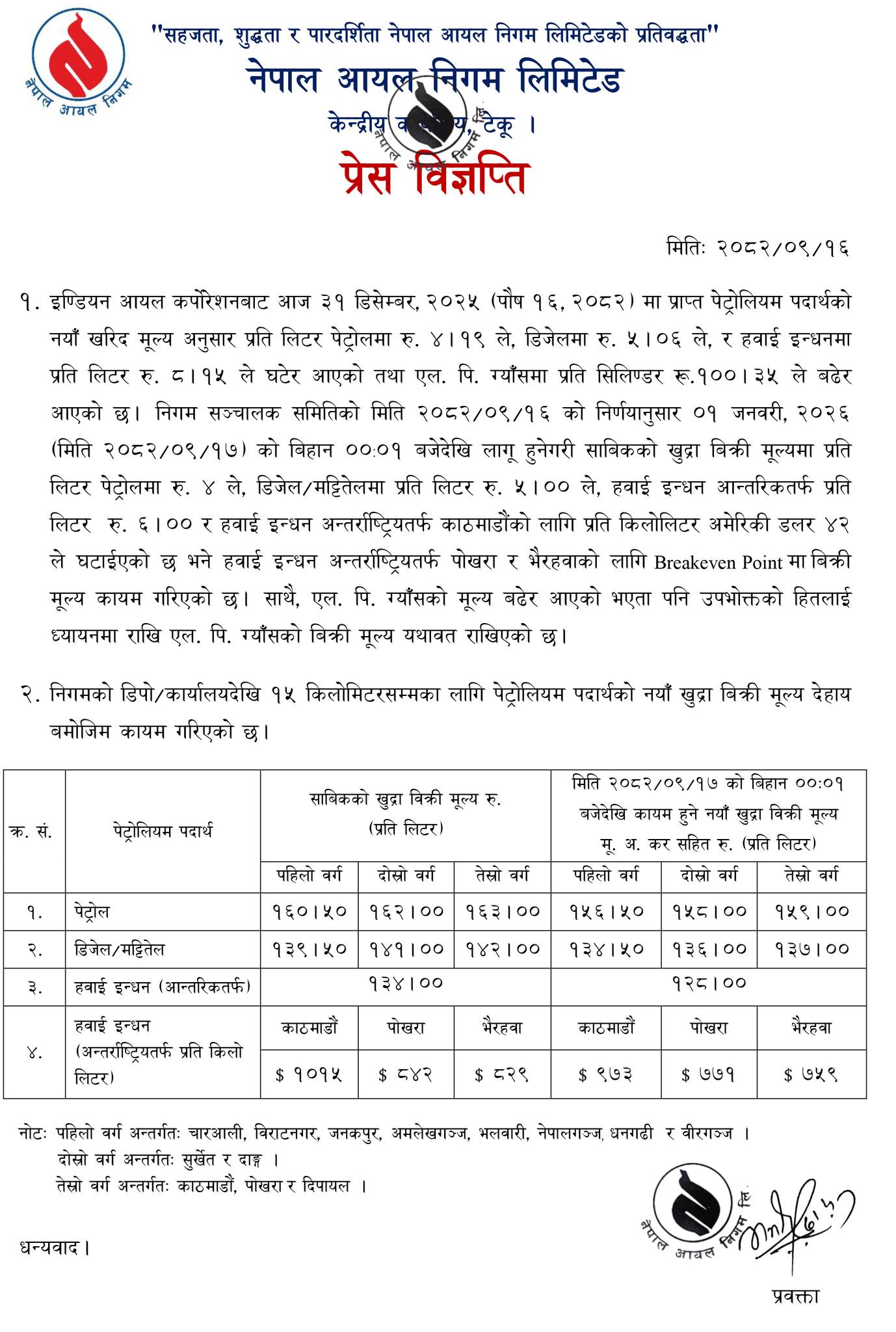 नयाँ मूल्य भारतीय आयल निगमले पठाएको मूल्यअनुसार समायोजन गरिएको हो। मूल्य समायोजनसँगै अब काठमाडौँ उपत्यकामा पेट्रोलको मूल्य प्रतिलिटर १५९ रुपैयाँ र डिजेल/मट्टितेलको १३७ रुपैयाँ कायम हुनेछ।