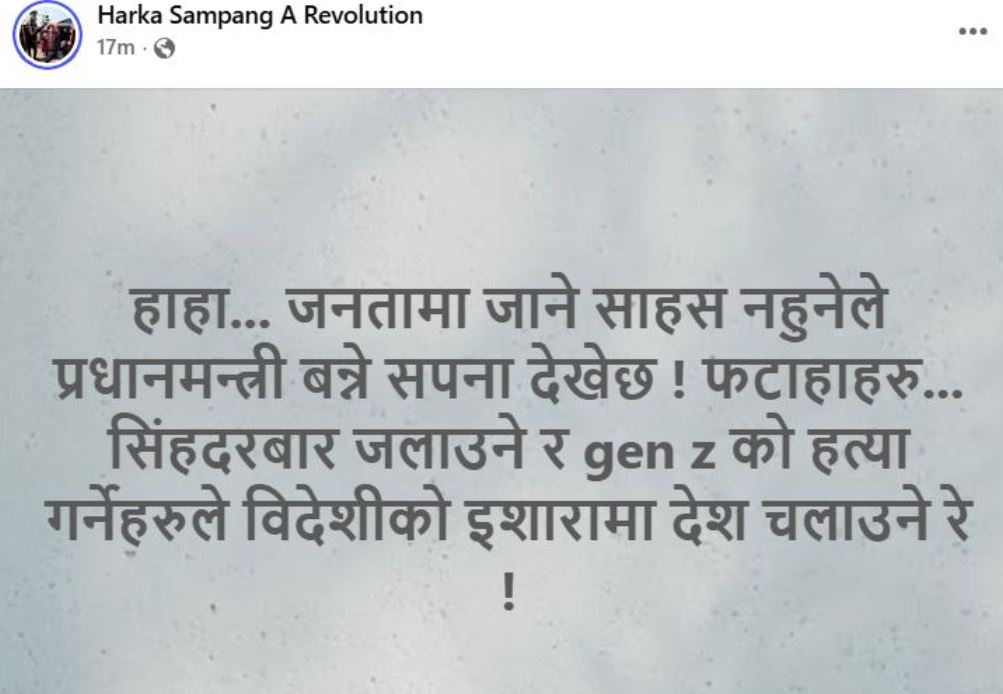 सामाजिक सञ्जालमार्फत उनले भनेका छन्, ‘हाहा… जनतामा जाने साहस नहुनेले प्रधानमन्त्री बन्ने सपना देखेछ! फटाहाहरू… सिंहदरबार जलाउने र जेनजीको हत्या गर्नेहरूले विदेशीको इशारामा देश चलाउने रे!’ हर्कले समेत स्थानीय तहमा स्वतन्त्र उम्मेदवारी दिएर चुनाव लडेका थिए।