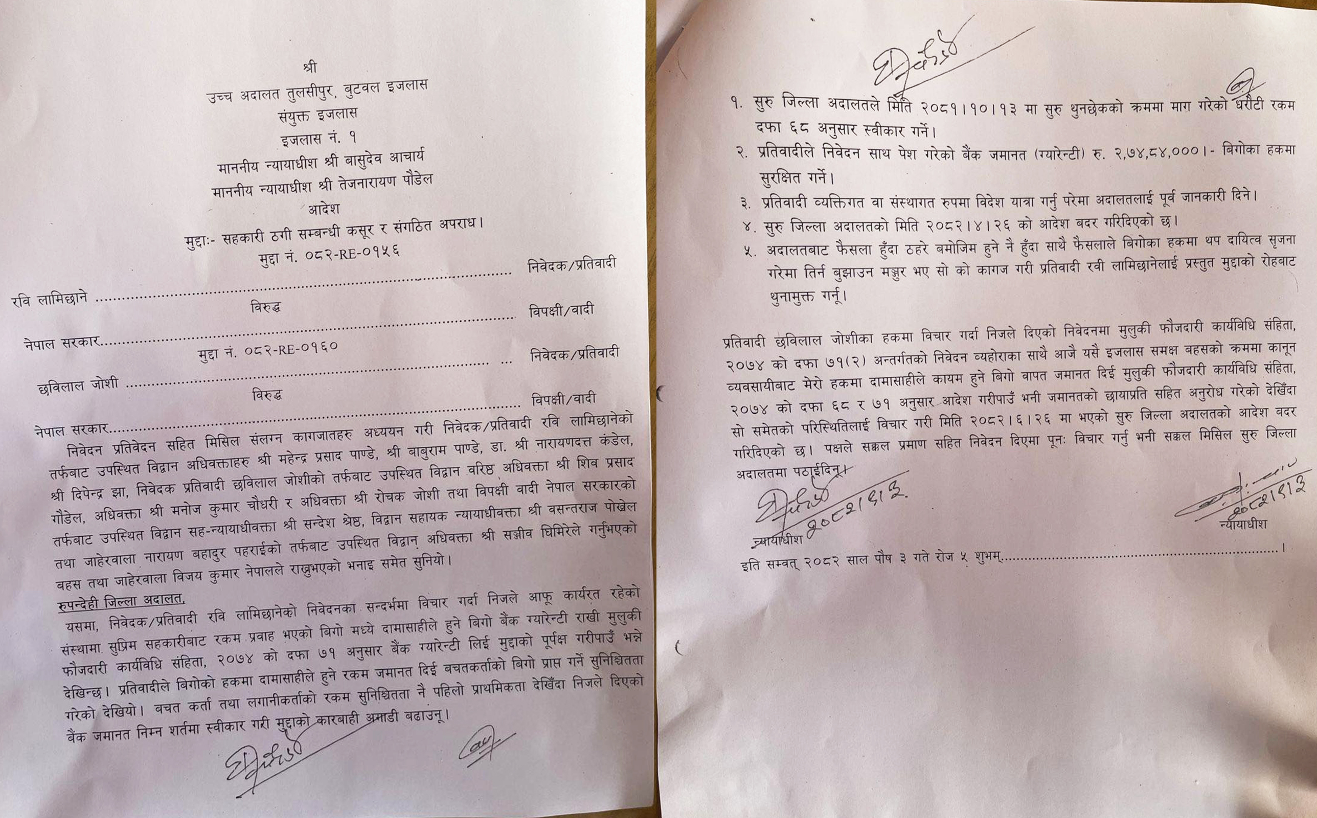 अब सो बराबरको रकम बुझाएपछि उनी थुनामुक्त हुनेछन्। लामिछानेलाई पुर्पक्षका लागि नख्खु कारागार राखिएको छ। यो आदेशपछि उनी रिहा हुनेछन्।