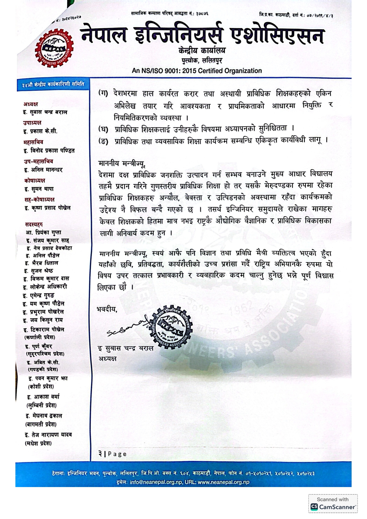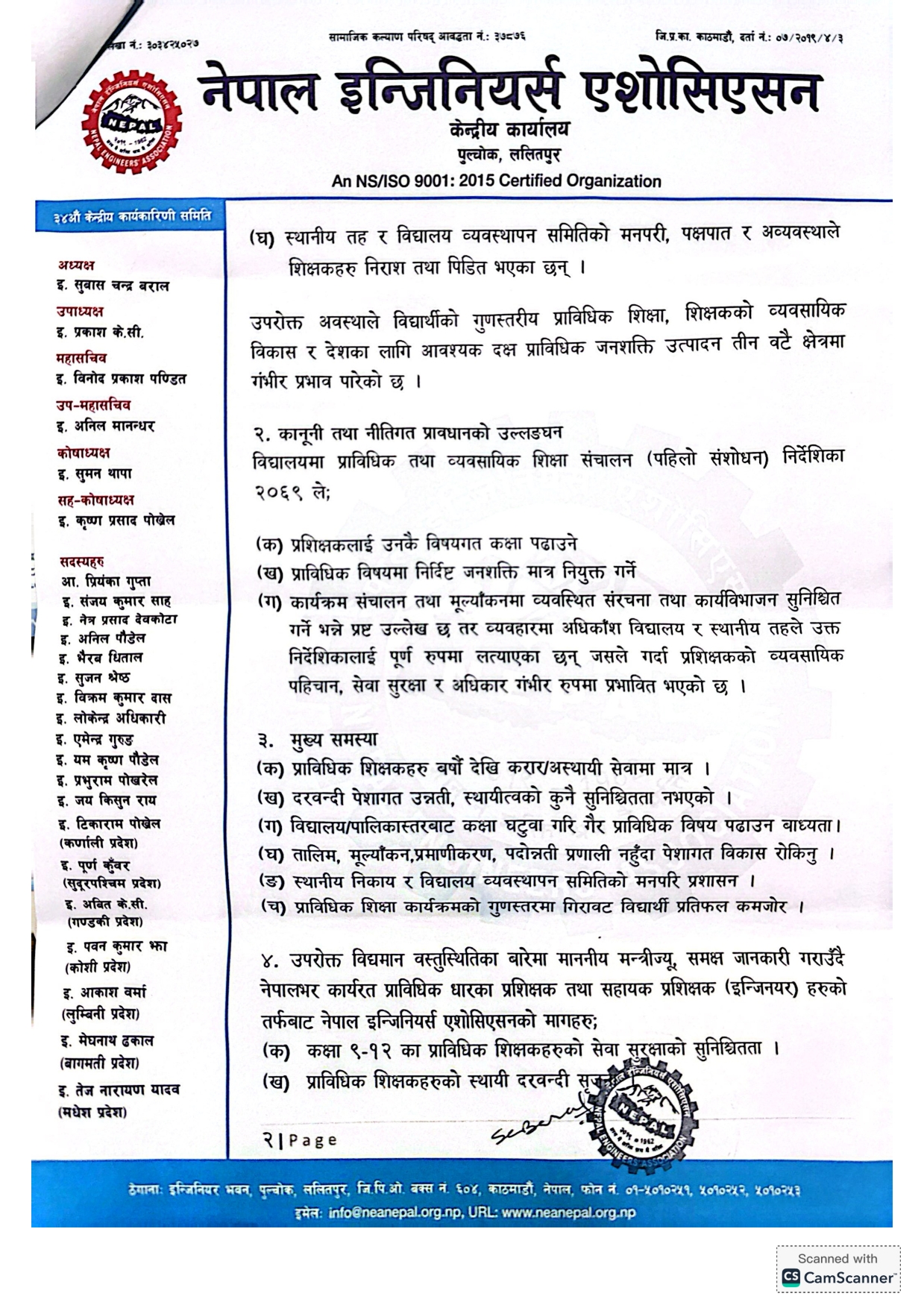 काठमाडौँ- नेपालका सामुदायिक विद्यालयमा कक्षा ९ देखि १२ सम्म सञ्चालन भइरहेका प्राविधिक तथा व्यवसायिक शिक्षा कार्यक्रमका शिक्षकहरू विभिन्न समस्या भोग्न बाध्य भएको भन्दै नेपाल इन्जिनियर्स एशोसिएसनले शिक्षा, विज्ञान तथा प्रविधिमन्त्री महावीर पुनसमक्ष ज्ञापनपत्र पेस गरेको छ।