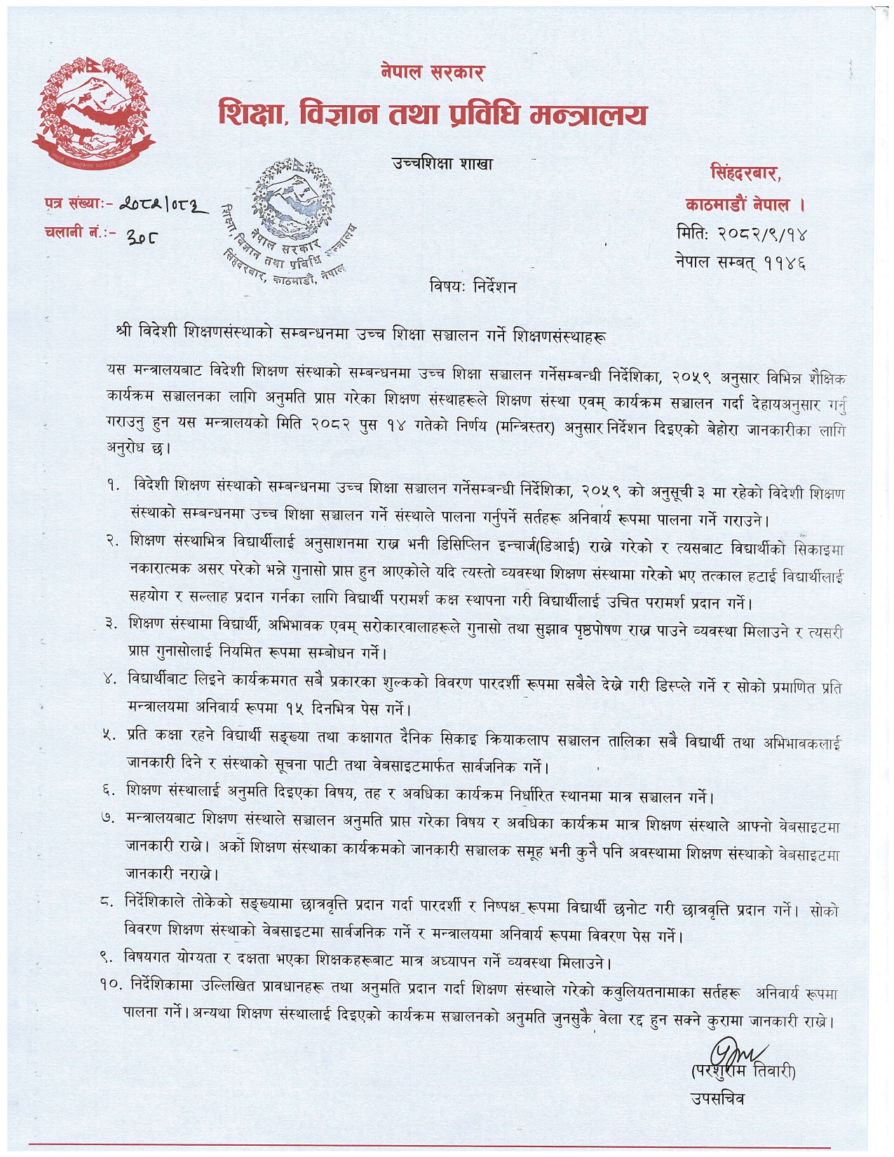 शिक्षामन्त्री महावीर पुनले विदेशी शिक्षण संस्थाको सम्बन्धनमा उच्च शिक्षा सञ्चालन गर्दै आएका कलेज तथा संस्थालाई १० बुँदे निर्देशन जारी गर्दै नियम र सर्त कडाइका साथ पालना गर्न स्मरण गराएका छन्।