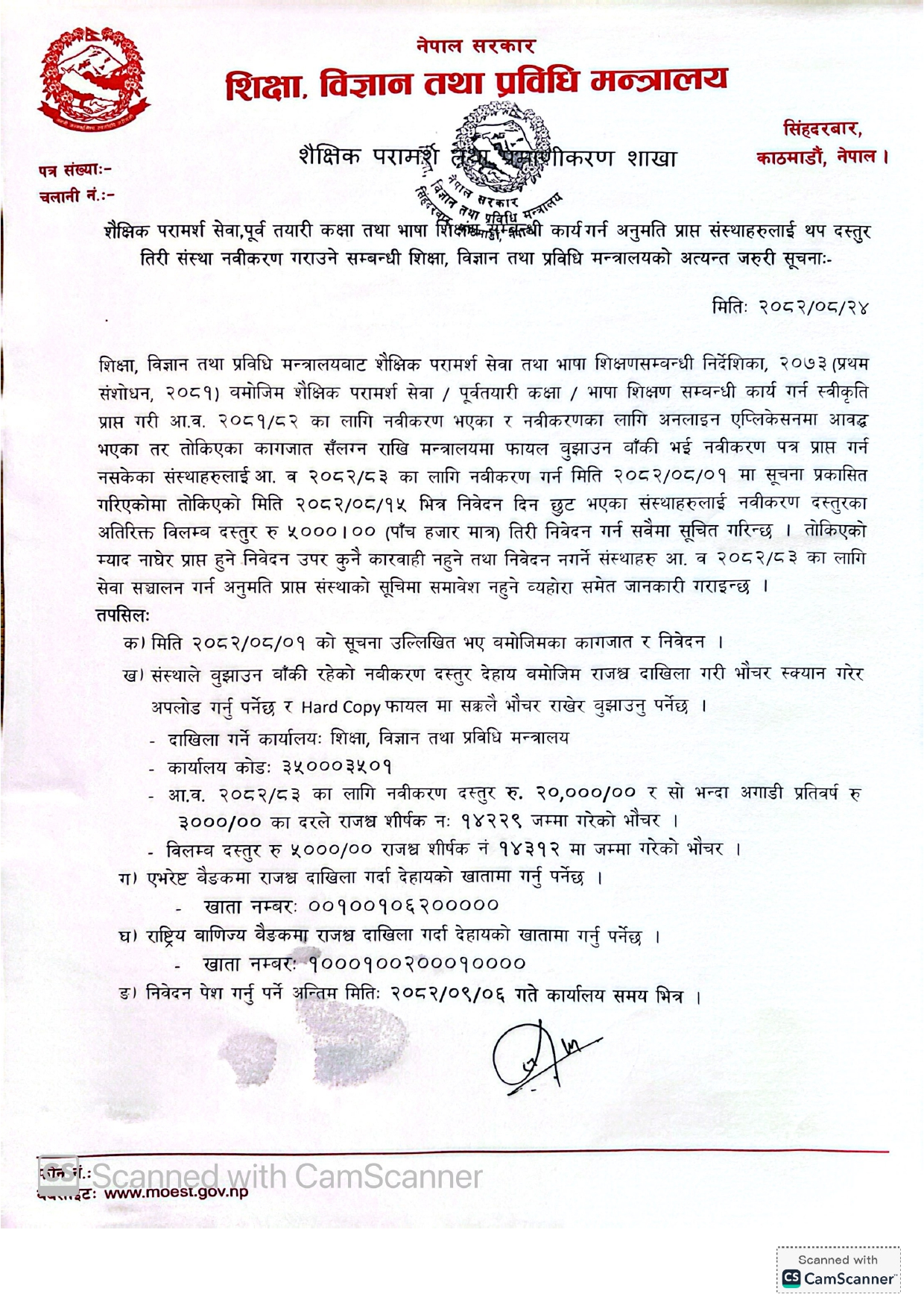 मन्त्रालयको शैक्षिक परामर्श तथा प्रमाणीकरण शाखाबाट बुधबार जारी उक्त सूचनामा आ.व. २०८१/८२ का लागि नवीकरण भइसकेका र अनलाइन एप्लिकेसनमा आवद्ध भए पनि आवश्यक कागजात मन्त्रालयमा पेस नगरेका संस्थाहरूलाई अब रु ५००० विलम्ब दस्तुर तिरी नवीकरण गर्न सकिने व्यवस्था गरिएको जनाएको छ।