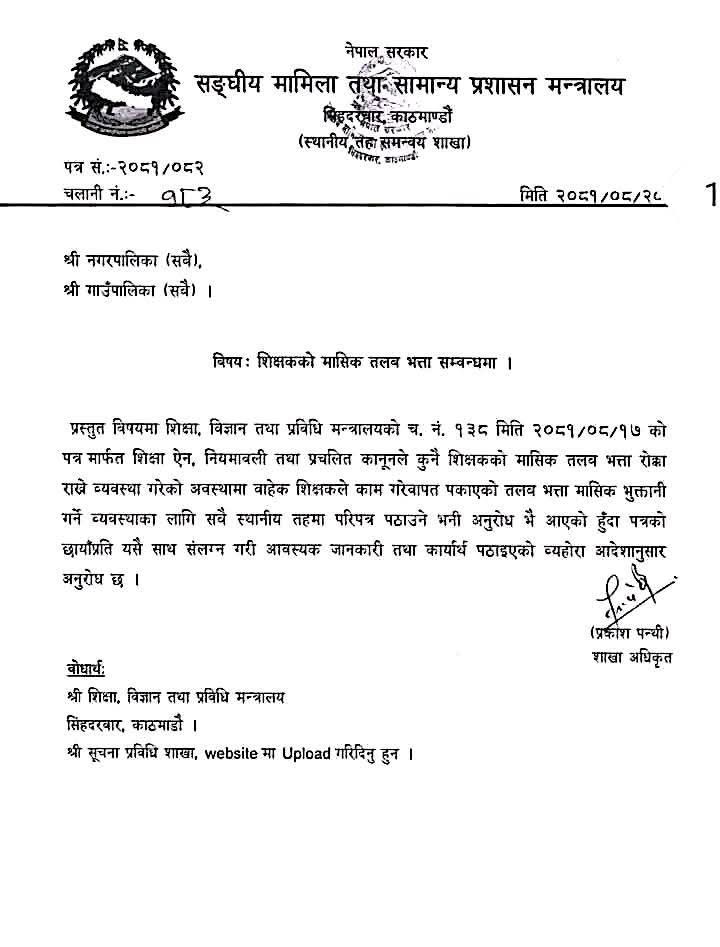 २०८१ मंसिर २० गते मन्त्रालयले मासिक रूपमा शिक्षकलाई तलब उपलब्ध गराउन नगरपालिका र गाउँपालिकालाई परिपत्र गरेको थियो। उक्त पत्र अहिले ‘भाइरल’ भएको हो।