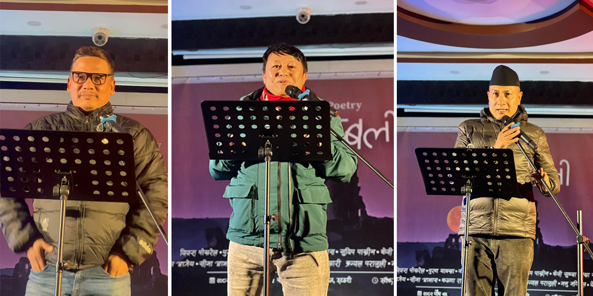 विवश पोखरेलले ‘नकचराहरूको नाममा,’ पुरुण याख्याले ‘पाना खाली नै छ,’ गोपाल देवानले ‘लाल अञ्जान जी,’ मुकुन्द प्रयासले ‘भ्रमको महाकाव्य,’ सुदीप पाख्रिनले ‘बोध,’ केजी सुब्बाले ‘आम्रपाली,’ शीर्षकको कविता प्रस्तुत गरे।
