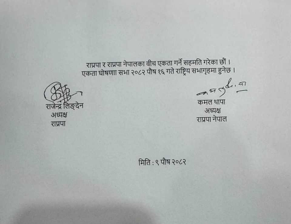 सहमति पत्रमा राप्रपा अध्यक्ष राजेन्द्र लिङ्देन र राप्रपा नेपाल अध्यक्ष कमल थापाले हस्ताक्षर गरेका छन्।