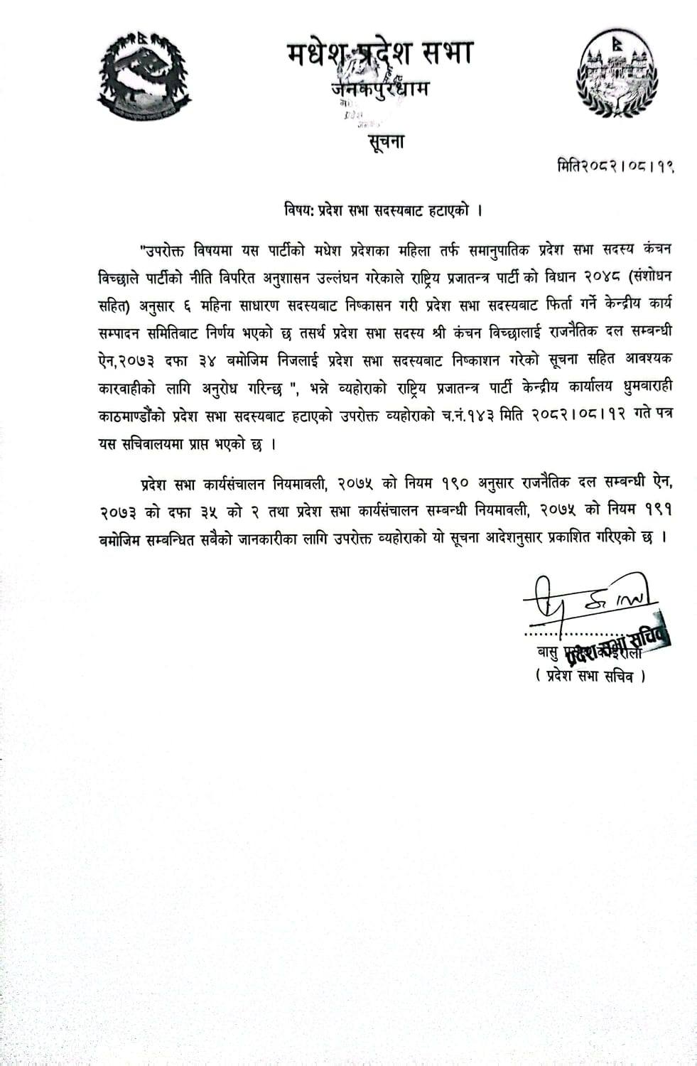 काठमाडौँ- मधेश प्रदेशमा राप्रपाकी एकमात्र सांसद कञ्चन विच्छा पदमुक्त भएकी छन्। पार्टीको सिफारिसमा प्रदेशसभा सचिवालयले प्रदेश सांसद विच्छालाई पदमुक्त गरेको हो।
