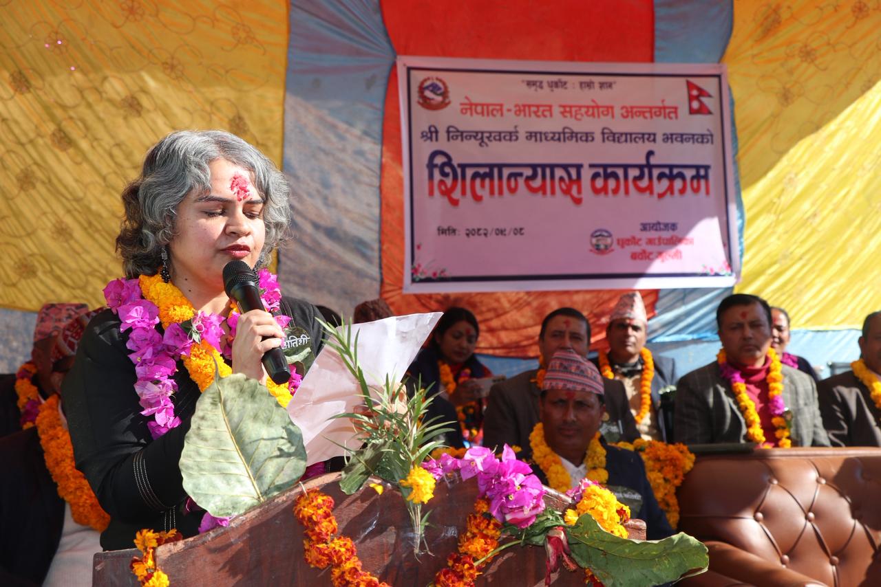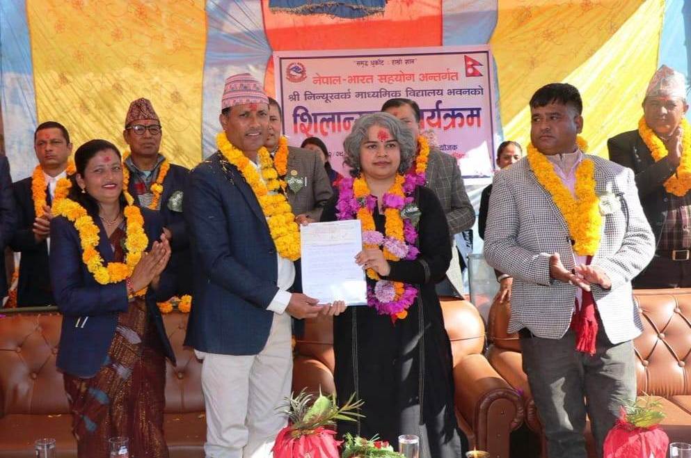 काठमाडौँ- गुल्मीको धुर्कोट गाउँपालिका–३ स्थित निन्यूखर्क माध्यमिक विद्यालय भवनको आज (मंगलबार) शिलान्यास गरिएको छ। भारत सरकारको आर्थिक सहयोगमा बन्ने भवनको काठमाडौँस्थित भारतीय राजदूतावासका काउन्सेलर गीताञ्जली ब्रैंडन र धुर्कोट गाउँपालिका अध्यक्ष भुपाल पोखरेलले संयुक्त रूपमा उद्घाटन गरेका हुन्।