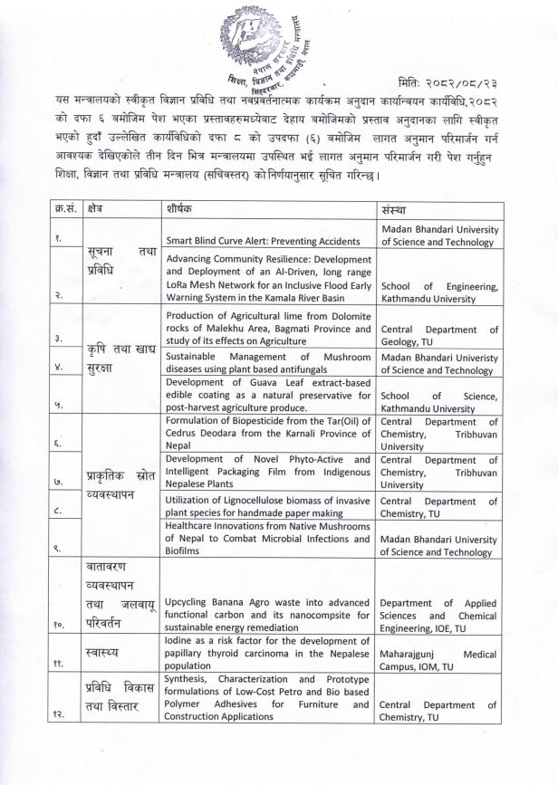 मन्त्रालयले स्वीकृत विज्ञान, प्रविधि तथा नवप्रवर्तनात्मक कार्यक्रम अनुदान कार्यविधि, २०८२ बमोजिम दफा ६ अनुसार मूल्यांकन गरी छनोट भएका प्रस्तावलाई अनुदान प्रदान गर्ने निर्णय गरेको हो।