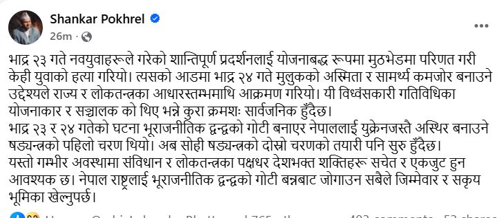 भाद्र २३ गते नवयुवाहरूले गरेको शान्तिपूर्ण प्रदर्शनलाई योजनाबद्ध रूपमा मुठभेडमा परिणत गरी केही युवाको हत्या गरिएको भन्दै पोखरेलले त्यसको आडमा भाद्र २४ गते मुलुकको अस्मिता र सामर्थ्य कमजोर बनाउने उद्देश्यले राज्य र लोकतन्त्रका आधारस्तम्भमाथि आक्रमण गरिएको दाबी गरेका छन्। त्यतिबेलाका विध्वंसकारी गतिविधिका योजनाकार र सञ्चालक को थिए भन्ने कुरा क्रमशः सार्वजनिक हुँदै गएको उनको भनाइ छ। रवि-बालेनबीच सात बुँदे राजनीतिक सहमति भएपछि पोखरेलको यस्तो अभिव्यक्ति आएको हो।