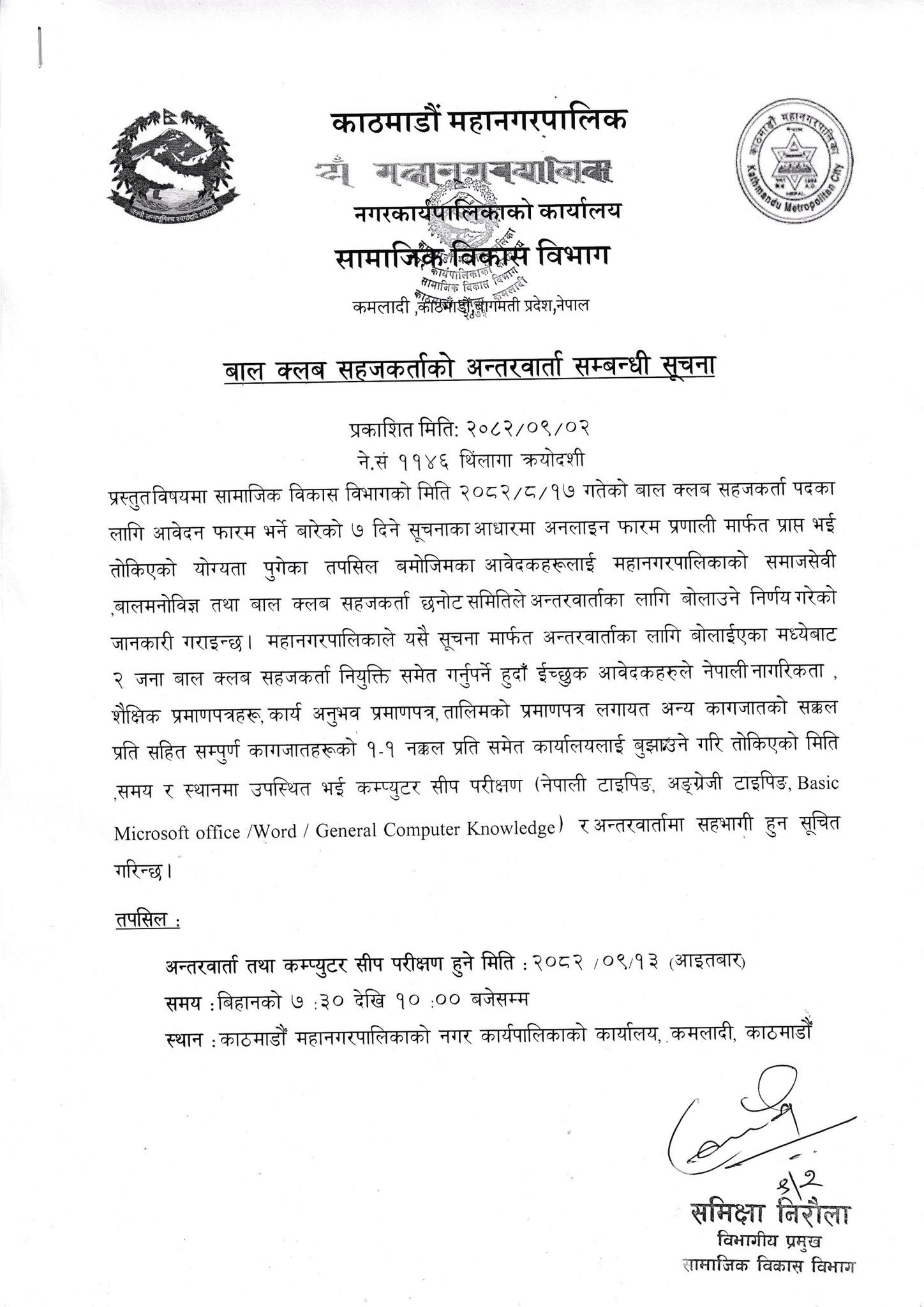 काठमाडौँ- काठमाडौँ महानगरपालिकाले बाल क्लब सहजकर्ता पदका लागि आवेदन दिएका योग्य आवेदकहरूलाई अन्तरवार्ता तथा कम्प्युटर सीप परीक्षणमा सहभागी हुन आह्वान गरेको छ।