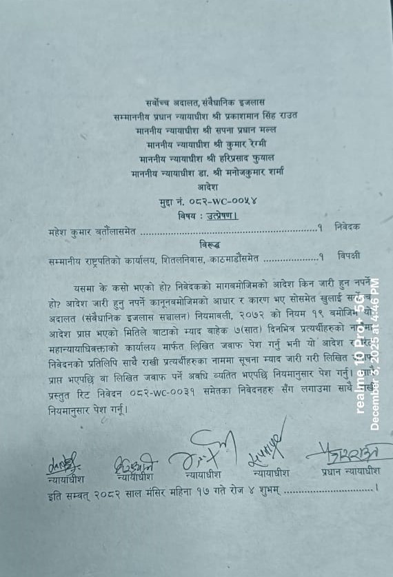 प्रधानन्यायाधीश प्रकाशमान सिंह राउत, न्यायाधीशहरू सपना प्रधान मल्ल, कुमार रेग्मी, हरिप्रसाद फुयाँल र मनोजकुमार रेग्मीसहितको संवैधानिक इजलासले रिटमाथि सुनुवाई गर्दै सात दिनभित्र लिखित जवाफ पेस गर्न आदेश दिएको हो।