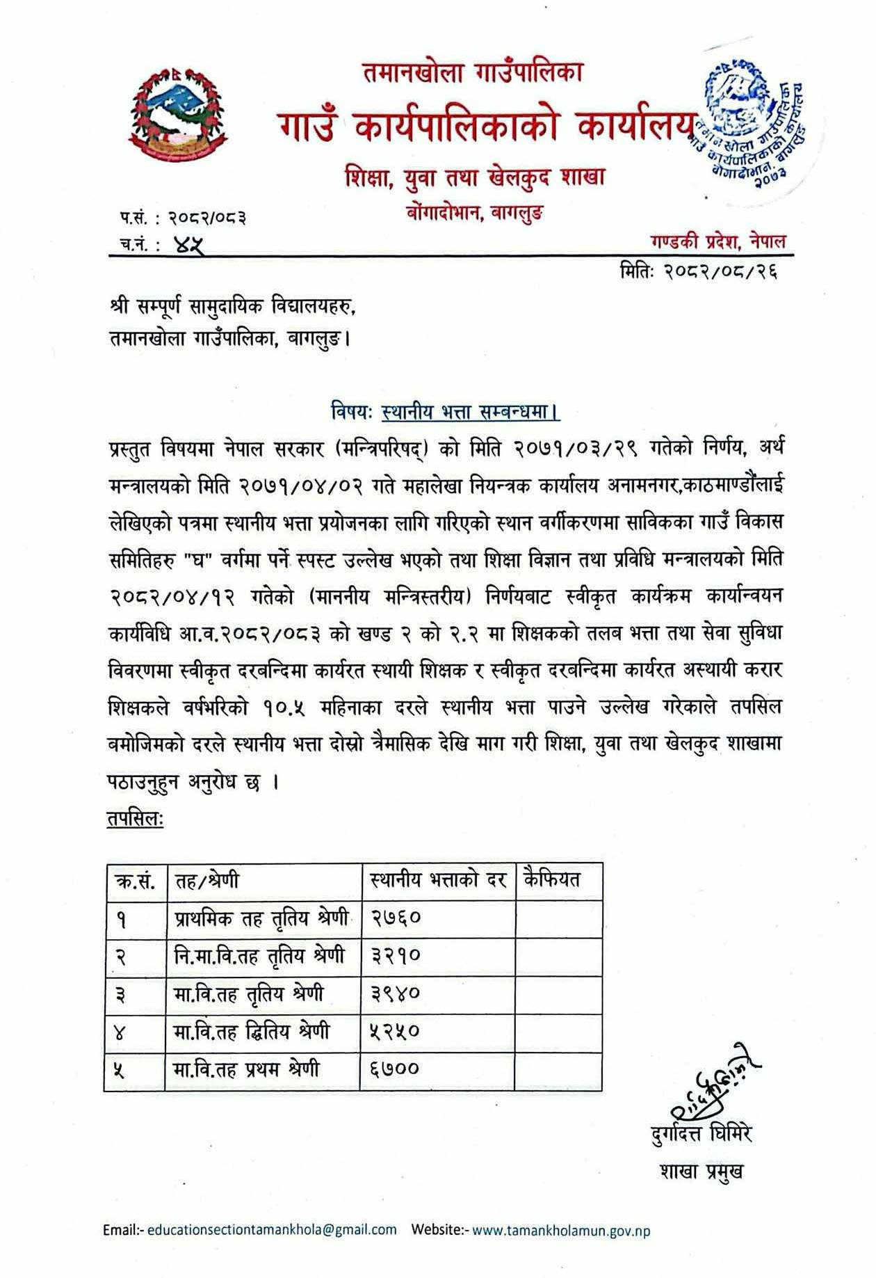 बागलुङ- तमानखोला गाउँपालिकाले सामुदायिक विद्यालयमा कार्यरत शिक्षकहरूलाई स्थानीय भत्ता माग गरी पेस गर्न अनुरोध गरेको छ।