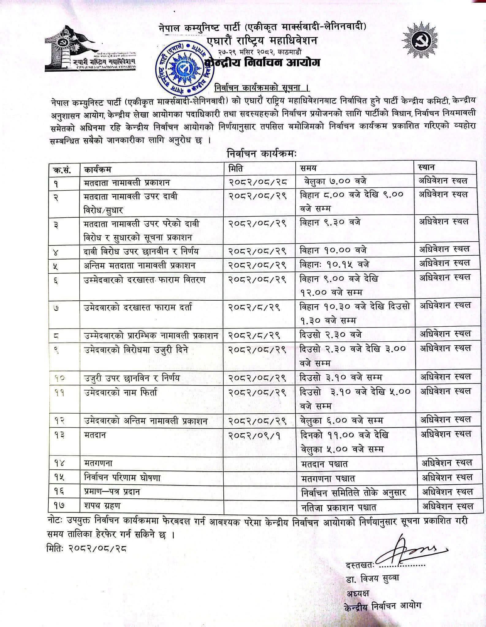काठमाडौँ- नेकपा एमालेको ११औँ महाधिवेशनअन्तर्गत निर्वाचन कार्यतालिका सार्वजनिक गरिएको छ। केन्द्रीय निर्वाचन आयोगले पुस १ गते मतदान गर्ने गरी निर्वाचन कार्यतालिका सार्वजनिक गरेको हो।