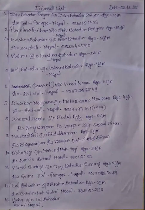 भारत-नेपाल सीमा सुनौलीबाट दिल्लीतर्फ जाँदै गरको यूपी २२ एटी ०२४५ को निजी बसमा कुल ४५ यात्रु सवार थिए। त्यसमा २५जना घाइते भएका थिए। बसमा यात्रा गर्ने अधिकांश यात्रुको ठेगानामा ‘बुटवल’ उल्लेख रहेको जानकारी दिइएको छ।