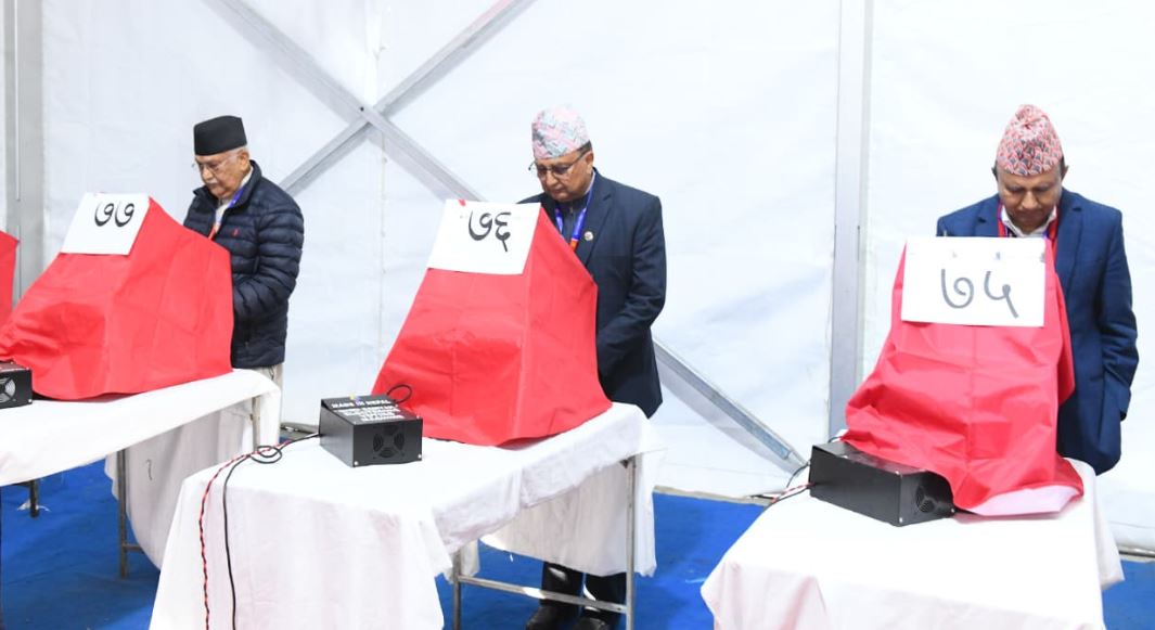 अध्यक्षका प्रत्याशी केपी शर्मा ओली मतदानस्थल पुगेसँगै मतदान सुरु भएको हो । ओली र अर्का प्रत्याशी ईश्वर पोखरेलले मत हालेर सुरु गरेका हुन्।