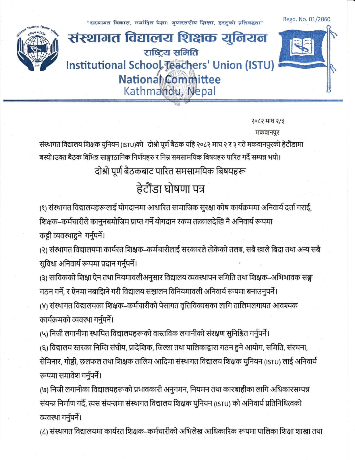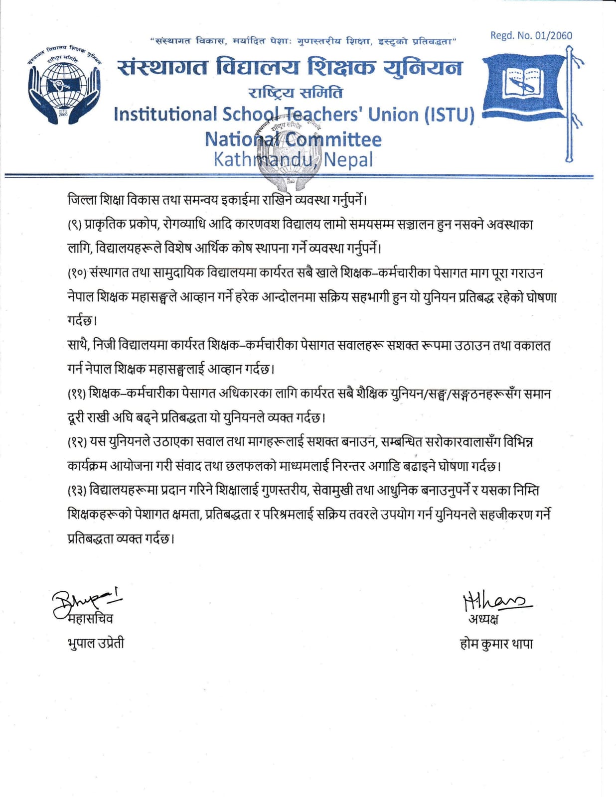 यस्तै, उठाइएका माग र सवाललाई प्रभावकारी बनाउन सरोकारवालासँग संवाद, छलफल तथा विभिन्न कार्यक्रममार्फत निरन्तर पहल गर्ने तथा विद्यालय शिक्षालाई गुणस्तरीय, सेवामुखी र आधुनिक बनाउन शिक्षकहरूको पेसागत क्षमता र प्रतिबद्धतालाई सक्रिय रूपमा उपयोग गर्ने प्रतिबद्धता व्यक्त गरिएको छ।