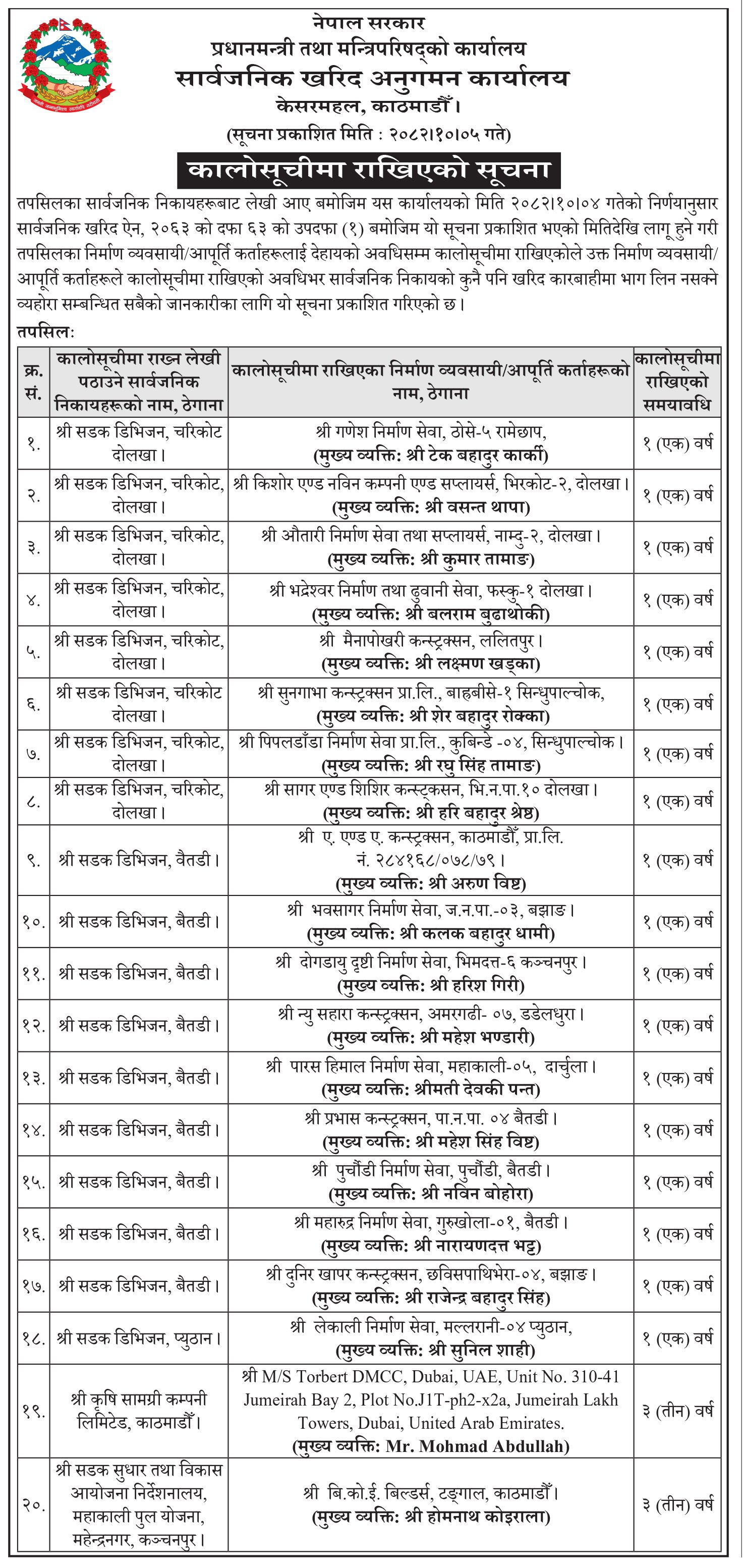 कालोसूचीमा परेकामध्ये सडक डिभिजन कार्यालय चरिकोट र बैतडीसँग सम्बन्धित निर्माण कम्पनीहरू सङ्ख्या बढी रहेको छ। साथै कृषि सामग्री कम्पनी लिमिटेड र सडक सुधार तथा विकास आयोजना निर्देशनालयको सिफारिसमा परेका केही कम्पनीलाई तीन वर्षका लागि कालोसूचीमा राखिएको कार्यालयले जनाएको छ।
