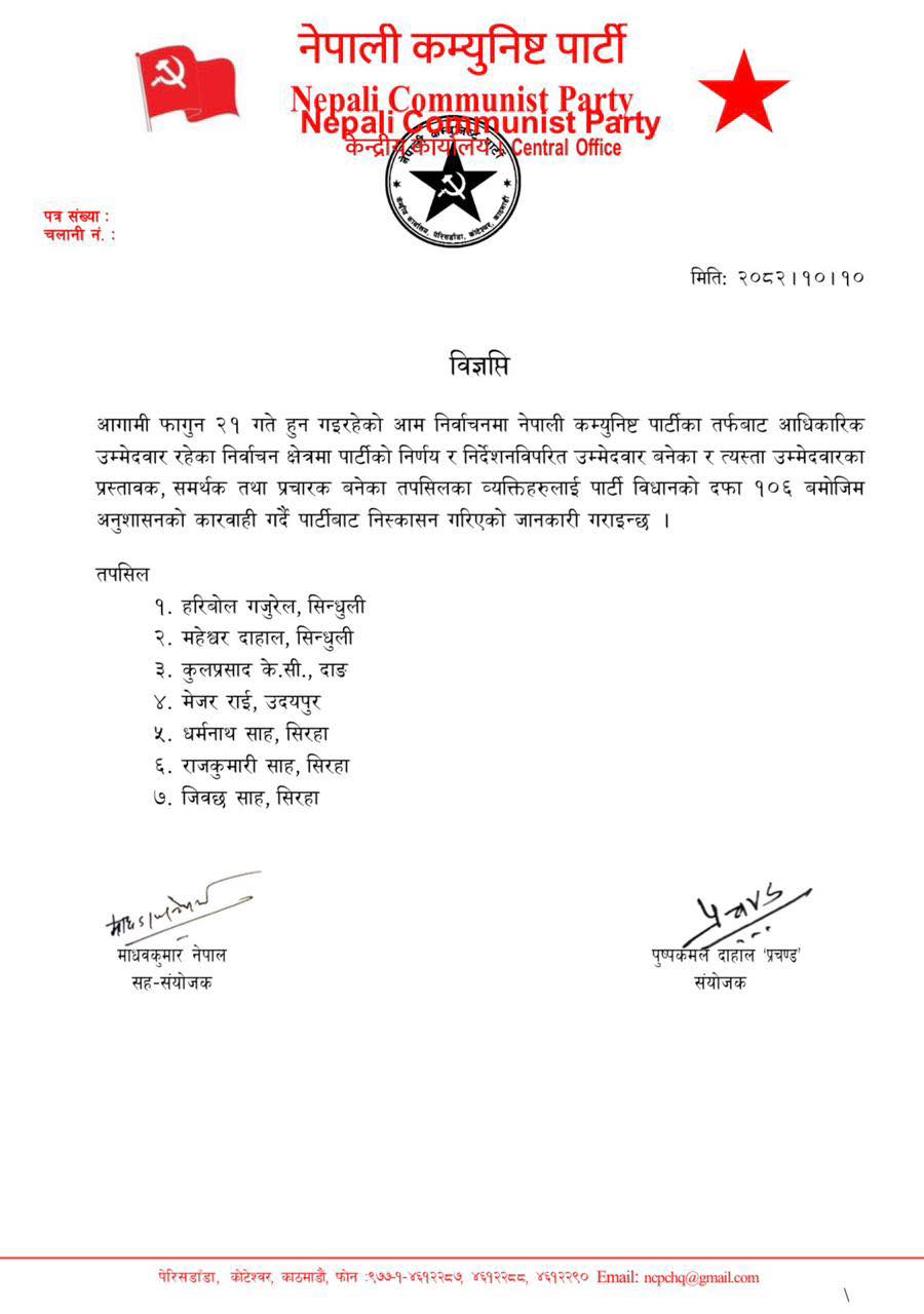 काठमाडौँ- नेपाल कम्युनिस्ट पार्टी नेकपाले ७ नेतालाई पार्टीबाट निस्कासन गरेको छ। नेकपाको कारबाहीमा पर्नेमा माओवादीका पूर्वसचिव हरिबोल गजुरेल, केन्द्रीय नेताहरू महेश्वर दाहाल, कुलप्रसाद केसीसहितका नेताहरू छन्।