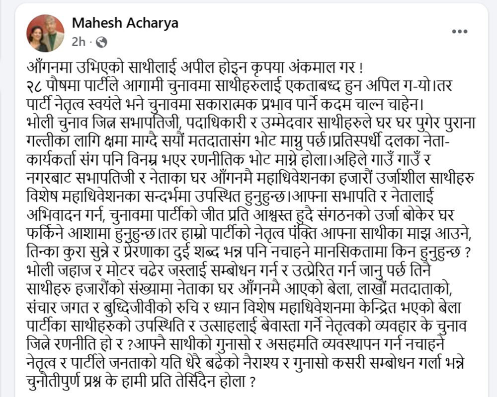 यसै सन्दर्भमा नेता आचार्यले मंगलबार बिहान सामाजिक सञ्जालमार्फत शीर्ष नेतृत्वप्रति असन्तुष्टि पोखेका हुन्। ‘आँगनमा उभिएको साथीलाई अपिल होइन, कृपया अंकमाल गर’, उनले लेखेका छन्, ‘अहिले गाउँगाउँ र नगरबाट सभापतिजी र नेताका घरआँगनमै महाधिवेशनका हजारौँ ऊर्जाशील साथीहरू विशेष महाधिवेशनका सन्दर्भमा उपस्थित हुनुहुन्छ। आफ्ना सभापति र नेतालाई अभिवादन गर्न, चुनावमा पार्टीको जितप्रति आश्वस्त हुँदै संगठनको ऊर्जा बोकेर घर फर्किने आशामा हुनुहुन्छ। तर हाम्रो पार्टीको नेतृत्व-पंक्ति आफ्ना साथीका माझ आउने, तिनका कुरा सुन्ने र प्रेरणाका दुई शब्द भन्न पनि नचाहने मानसिकतामा किन हुनुहुन्छ।’